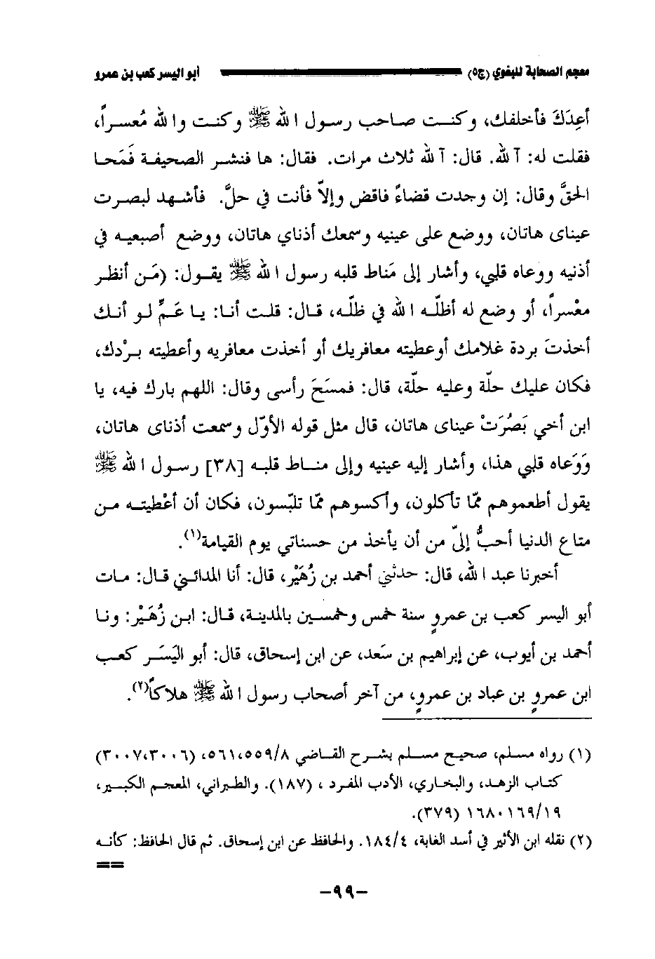 أخبرنا عبد الله قال حدثني أحمد بن زهير قال أخبرنا المدائني قال مات أبو اليسر كعب بن عمرو سنة خمس وخمسين بالمدينة قال: ابن زهير: ونا أحمد بن أيوب عن إبراهيم بن سعد عن ابن إسحاق قال: أبو اليسر كعب بن عمرو بن عباد بن عمرو من آخر أصحاب رسول الله صلى الله عليه وسلم هلاكا.