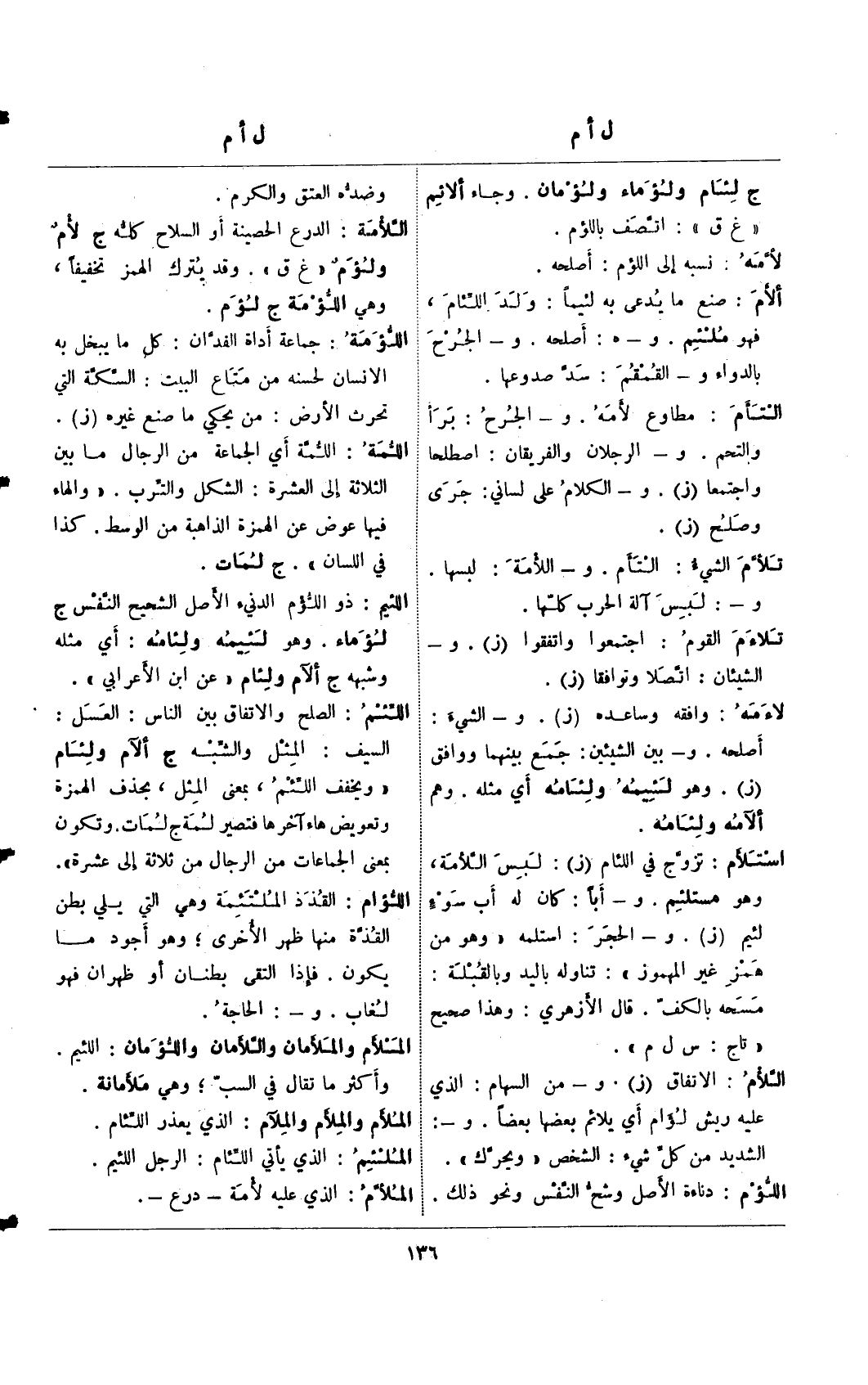 اللأم: الاتفاق (ز). و- من السهام: الذي عليه ريش لؤام أي يلائم بعضها بعضًا. و-: الشديد من كل شئ: الشخص "يحرك".