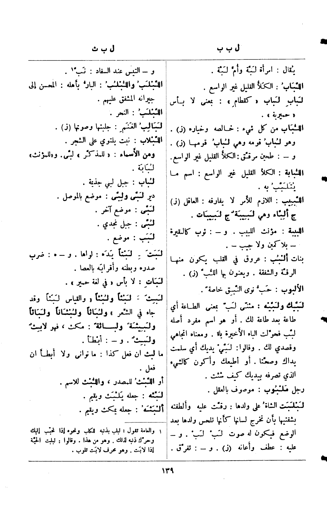لبلبت الشاة علي ولدها: رقت عليه وألطفته بشفتيها بأن تخرج لسانها كأنها تلحس ولدها بعد الوضع فيكون له صوت لب لب. و- عليه: عطف وأعانه (ز). و-: تفرق.