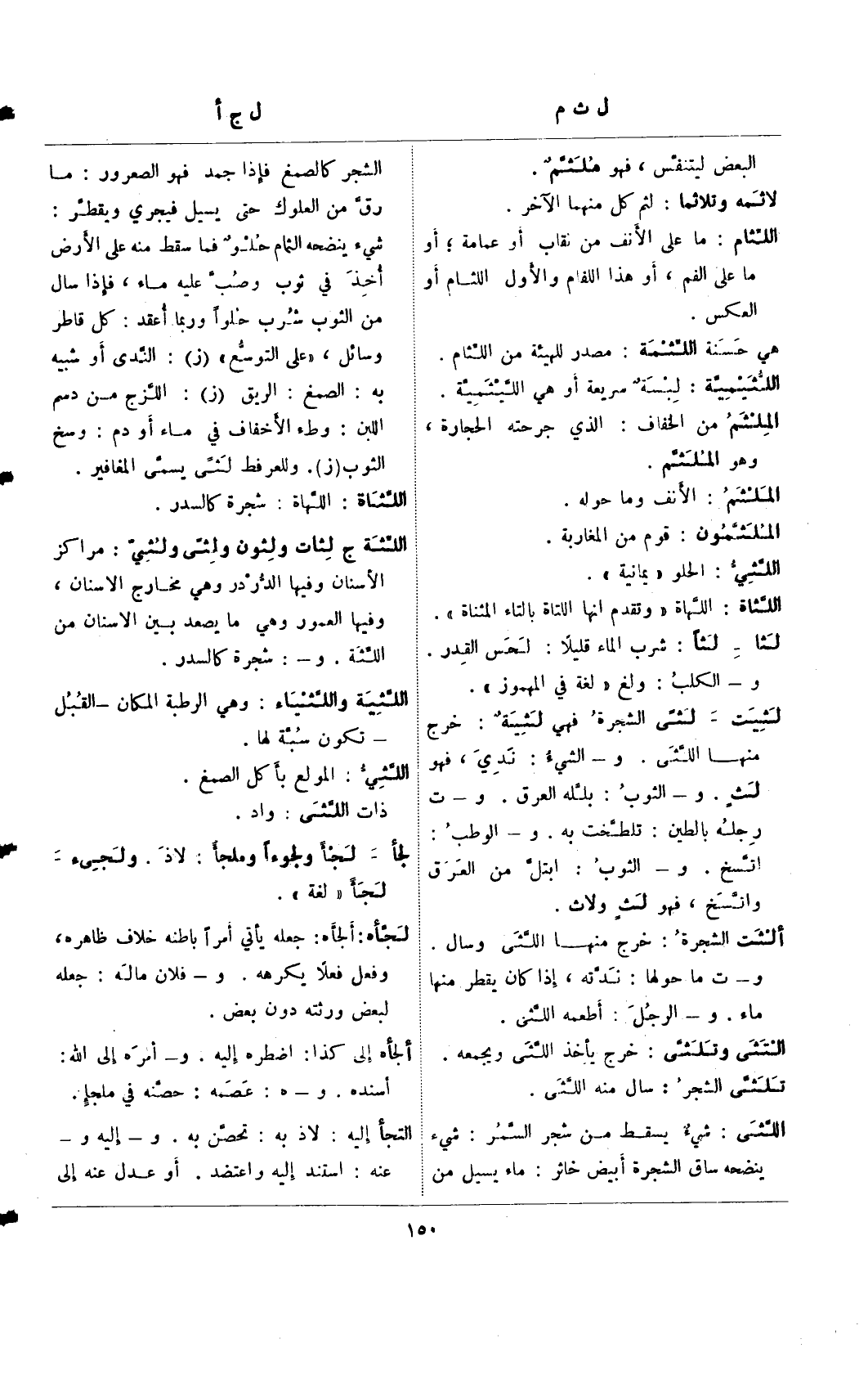 لثيت – لثي الشجرة فهي لثية: خرج منها اللثي. و-الشيء: ندي، فهو لث. و- الثوب: بلله العرق. و-ت رجله بالطين: تلطخت به. و- الوطب: اتسخ. و- الثوب: ابتل من العرق واتسخ، فهو لث ولاث.