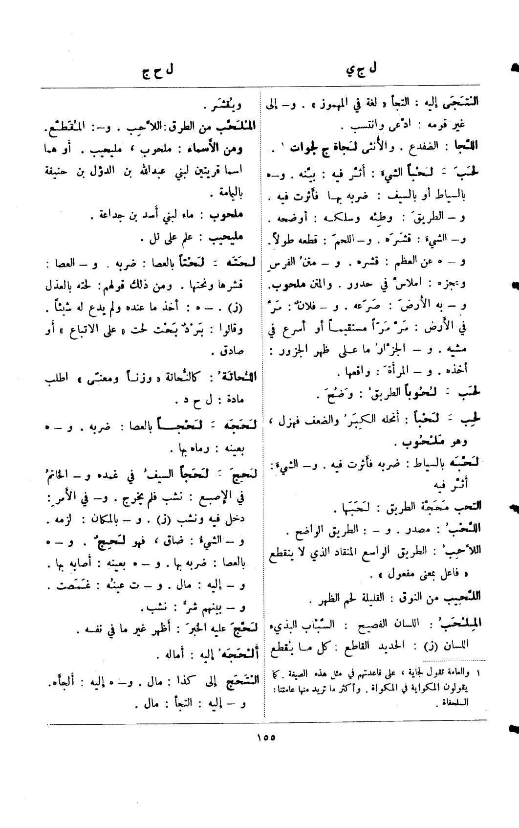 لحب – لحبأ الشيء: أثر فيه: بينه. و- هـ بالسياط أو بالسيف: ضربه بها فأثرت فيه. و- الطريق: وطئه وسلكه: أوضحه. و- الشيء: قشره. و- اللحم: قطعه طولًا. و- هـ عن العظم: قشره. و- متن الفرس وعجزه: املاس في حدور. والمتن هلحوب. و- به الأرض: صرعه. و- فلان: مر في الأرض: مر مرًا مستقيمًا أو أسرع في مشيه. و- الجزار ما علي ظهر الجزور: أخذه. و- المرأة: واقعها.