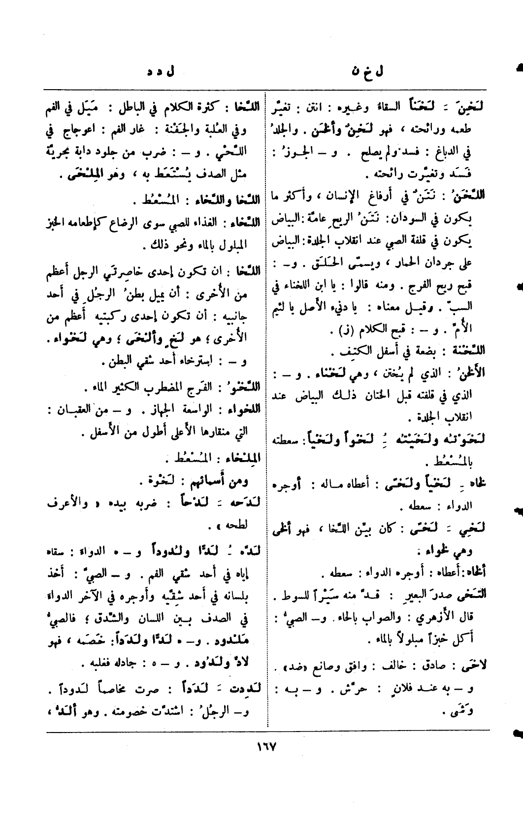 لده – لدًا ولدودًا و-هـ الدواء: سقاه إياه في أحد شقي الفم. و- الصبي: أخذ بلسانه في أحد شقيه وأوجره في الآخر الدواء في الصدف بين اللسان والشدق؛ فالصبي ملدود. و-هـ لدًا ولددًا: خصمه، فهو لاد ولدود. و-هـ: جادله فغلبه.