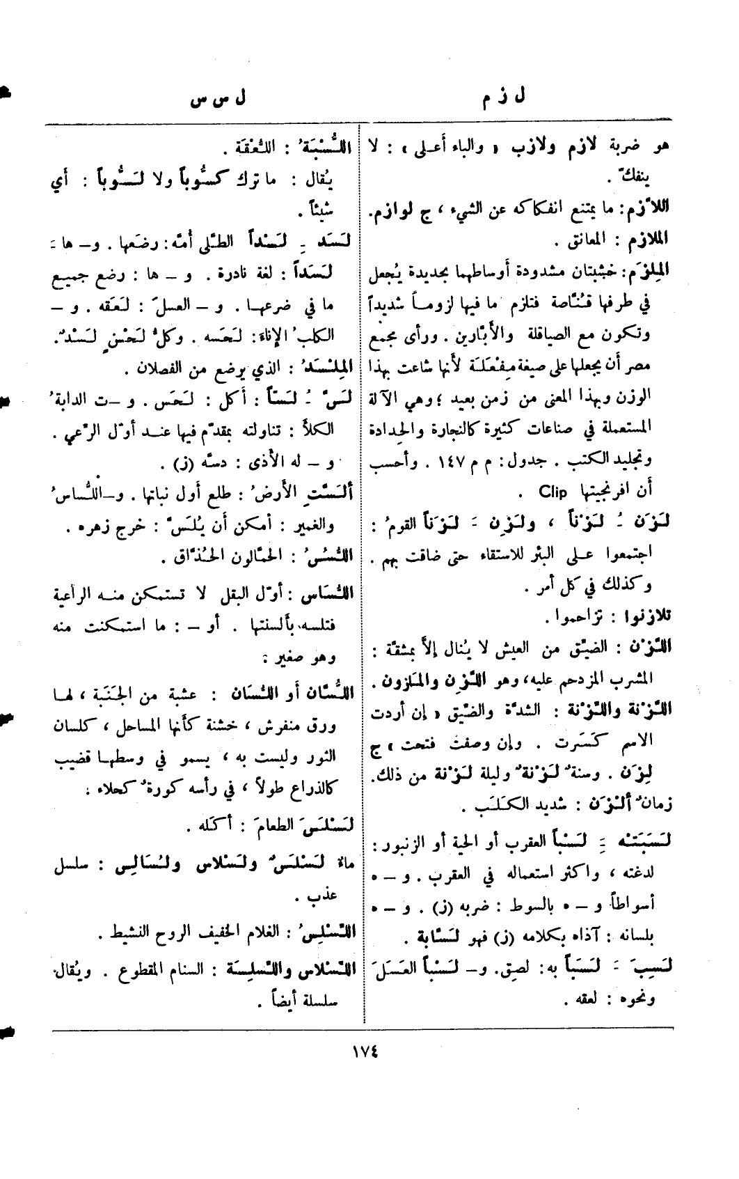 لس – لسنًا: أكل: لحس. و-ت الدابة الكلأ: تناولته بمقدم فيها عند أول الرعي. و- له الأذي: دسه (ز).