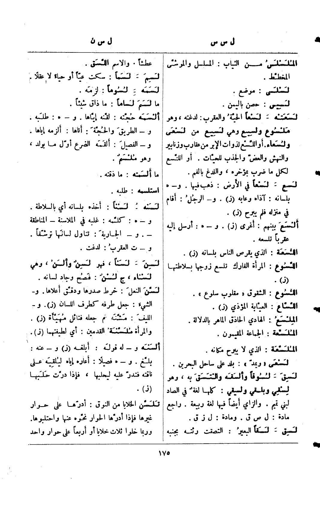 لسن النعل: خرط صدرها ودقتق أعلاها. و- الشيء: جعل طرفه كطرف اللسان (ز). و- الليف: مشنه ثم جعله فتائل مهيأة (ز). والمرأة ملسنة القدمين: أي لطيفتهما (ز).