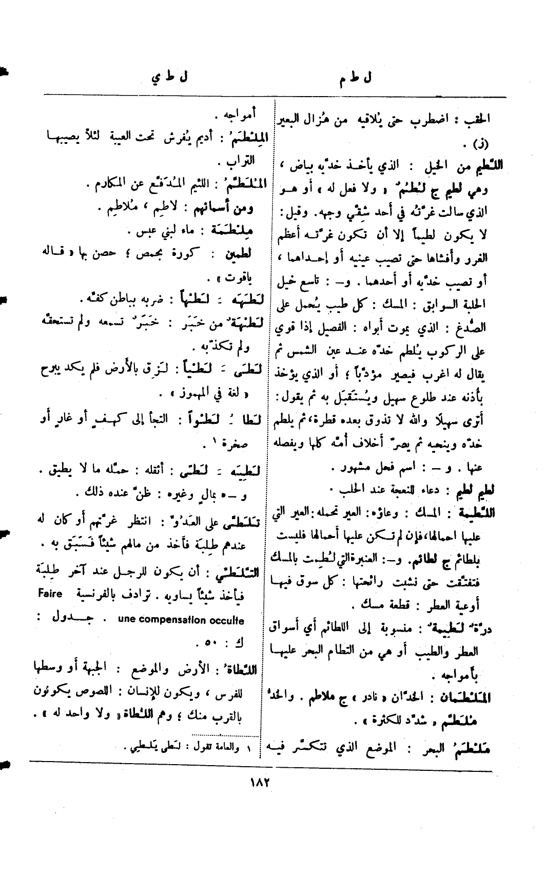 اللطم من الخيل: الذي يأخذ خديه بياض، وهي لطم د لطم "ولا فعل له" أو هو الذي سالت غرته في أحد سقي وجهه. وقيل: لا يكون لطيمًا إلا أن تكون غرته أعظم الغرر وأفشاها حتي تصيب عينيه أو إحداهما، أو تصيب خديه أو أحدهما. و-: تاسع خيل الحلبة السوابق: المسك: كل طيب يحمل علي الصدغ: الذي يموت أبواه: الفصيل إذا قوي علي الركوب يلطم خده عند عين الشمس ثم يقال له اغرب فيصير مؤدبًا؛ أو الذي يؤخذ بأذنه عند طلوع سهيل ويستقبل به ثم يقول: أتري سهيلًا والله لا تذوق بعده قطرة، ثم يلطم خده وينحيه ثم يصر أخلاف أمه كلها ويفصله عنها. و-: اسم فحل مشهور.