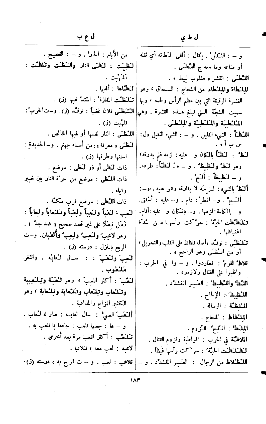 لظ – لظًا بالمكان و- عليه: لزمه فلم يفارقه، وهو لظ ولظيظ. و- هـ لظًا: طرده. و- لظيظًا: ألح.