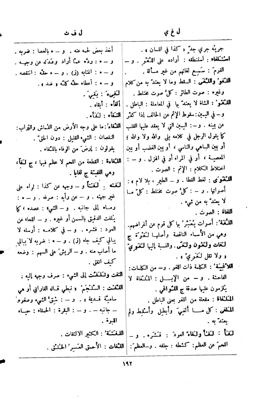 لفته – لفتًا و-وجهه عن كذا: لواه علي غير جهته. و-عن رأيه: صرفه. و-هـ: رماه إلي جانبه. و- الشيء: عصده، كما يلفت الدقيق بالسمن أو غيره. و- اللحاء عن العود: فشره. و- في كلامه: أرسله لا يبالي كيف جاء (ز). و-هـ: ضربه لا يبالي ما أصاب منه. و- الريش علي السهم: وضعه كيف اتفق.