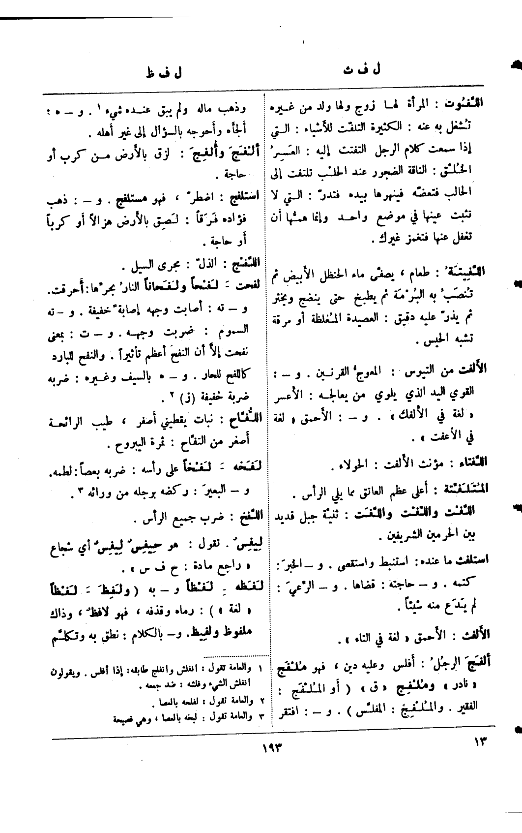 الألفت من التيوس: المعوج القرنين. و-: القوي اليد الذي يلوي من يعالجه: الأعسر "لغة في الألفك". و-: الأحمق "لغة في الأعفت".