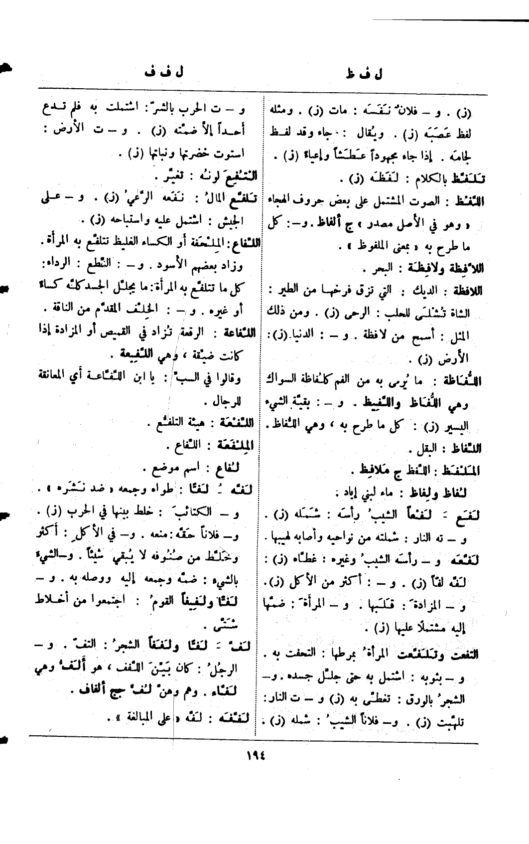لف – لفًا ولففًا الشجر: التف. و- الرجل: كان بين اللفف، هو ألف وهي لفاء. وهم وهن لف جج ألفاف.