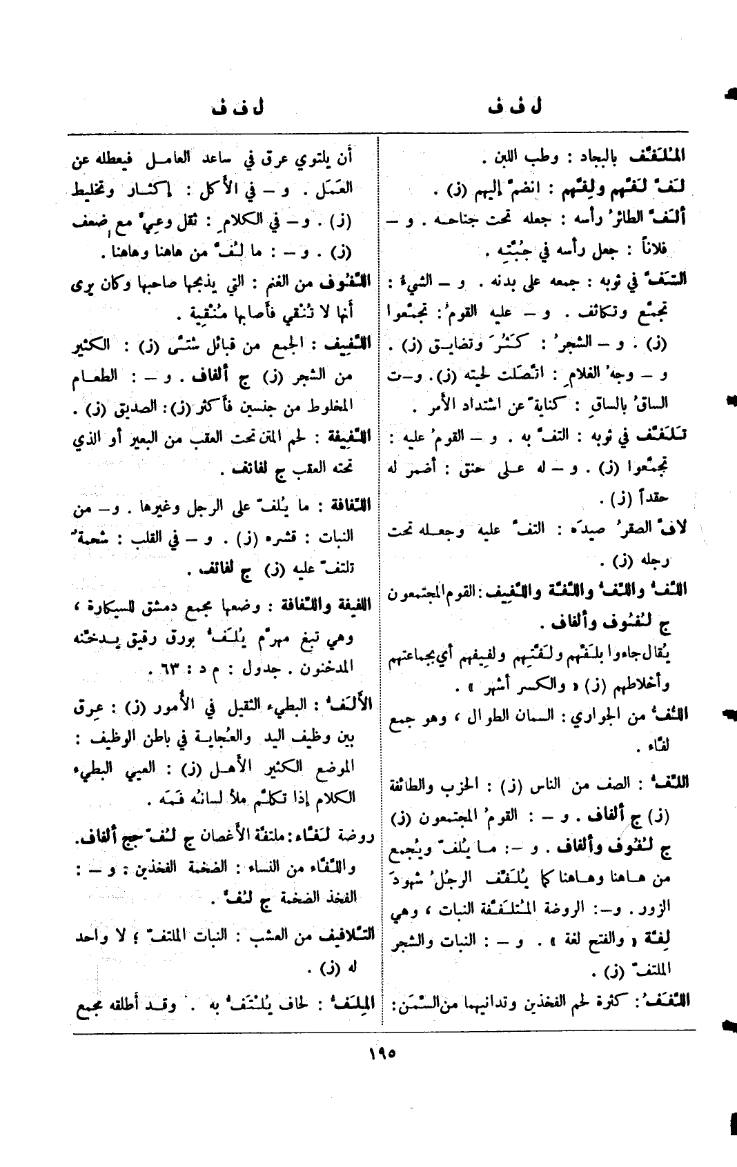 اللف: الصف من الناس (ز): الحزب والطائفة (ز) ج ألفاف. و-: القوم المجتمعون (ز) ج لفوف وألفاف. و-: ما يلف ويجمع من ها هنا وها هنا كما يلفف الرجل شهود الزور. و-: الروضة المتلففة النبات، وهي لفة: والفتح لغة". و-: النبات والشجر الملتف (ز).
