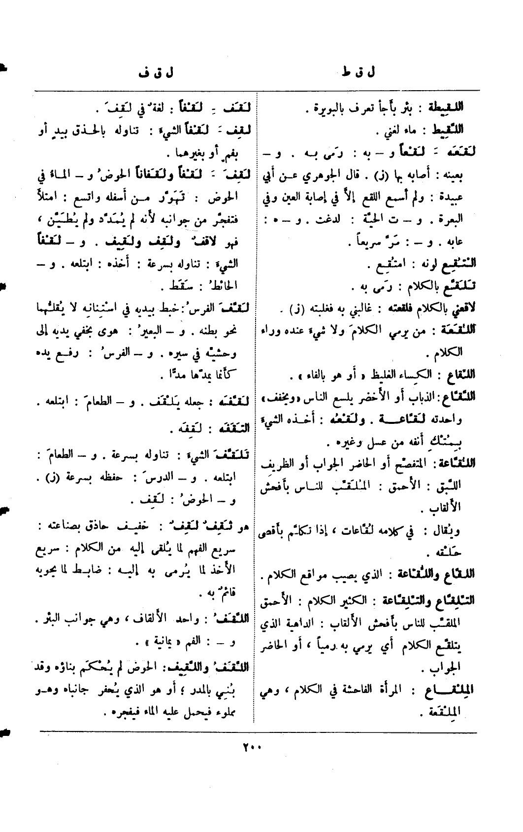 لقف – لقفًا ولقفانًا الحوض و- الماء في الحوض: تهور من أسفله واتسع: امتلأ فتفجر من جوانبه لأنه لم يمدد ولم يطين، فهو لاقف ولقف ولقيف. و- لقفًا الشيء: تناوله بسرعة: أخذه: ابتلعه. و- الحائط: سفط.