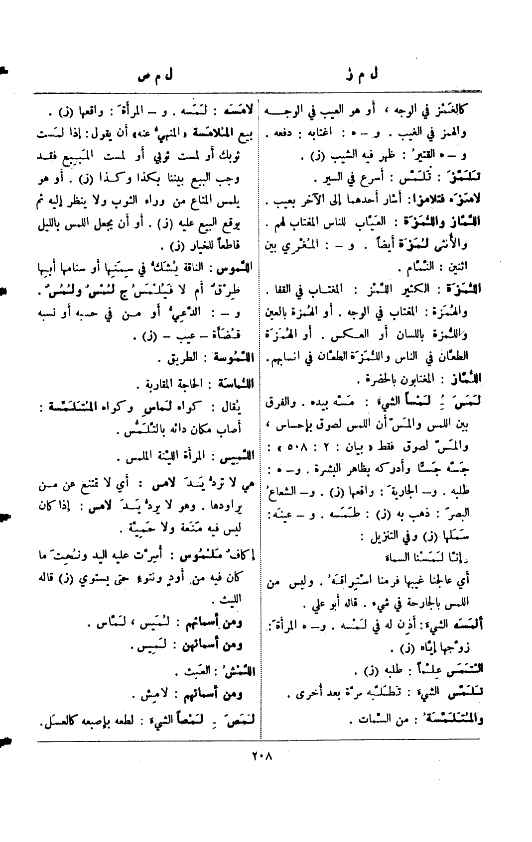 لمس- لمسًا الشئ: مسه بيده. والفرق بين اللمس والمس أن اللمس لصوق بإحساس، والمس لصوق فقط "بيان: 2: 508": جسه جسًا وأدركه بظاهر البشرة. و- هـ: طلبه. و- الجارية: واقعها (ز). و- الشعاع البصر: ذهب به (ز): طمسه. و- عينه: سملها (ز) وفي التنزيل: