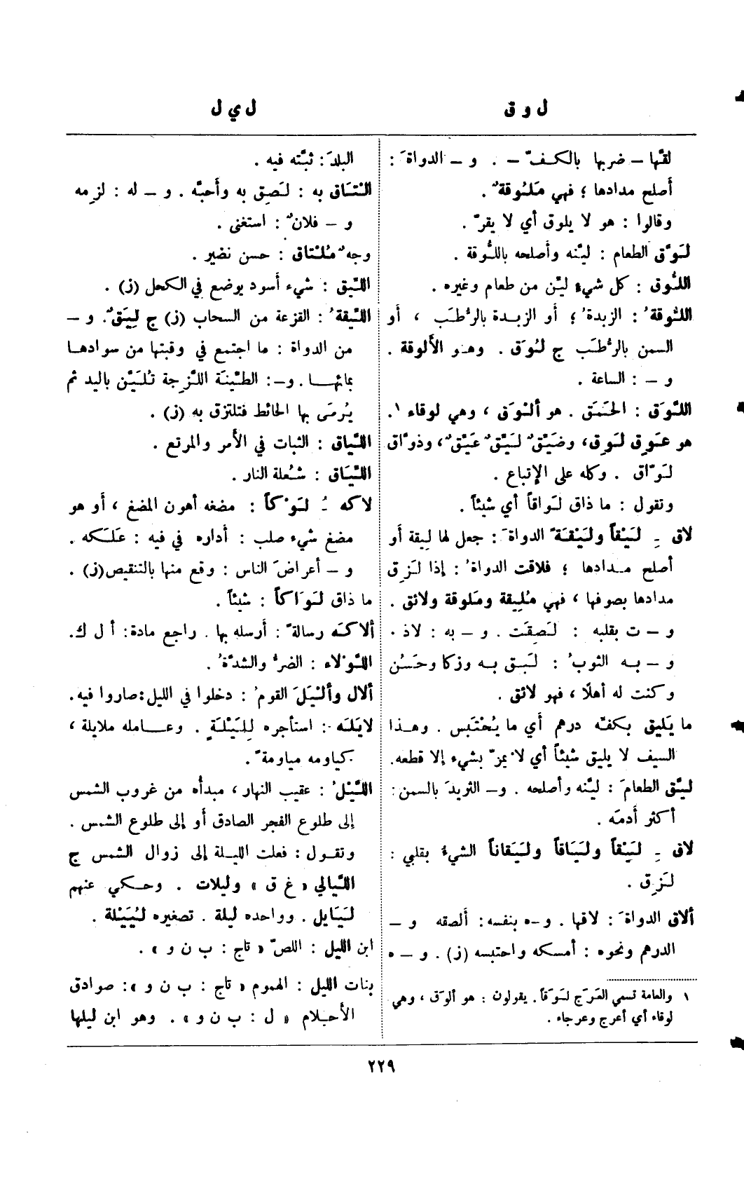 لاق – ليقًا وليقة الدواة: جعل لها ليقة أو أصلح مدادها؛ فلاقت الدواة: إذا لزق مدادها بصوفها، فهي مليقة وملوقة ولائق.