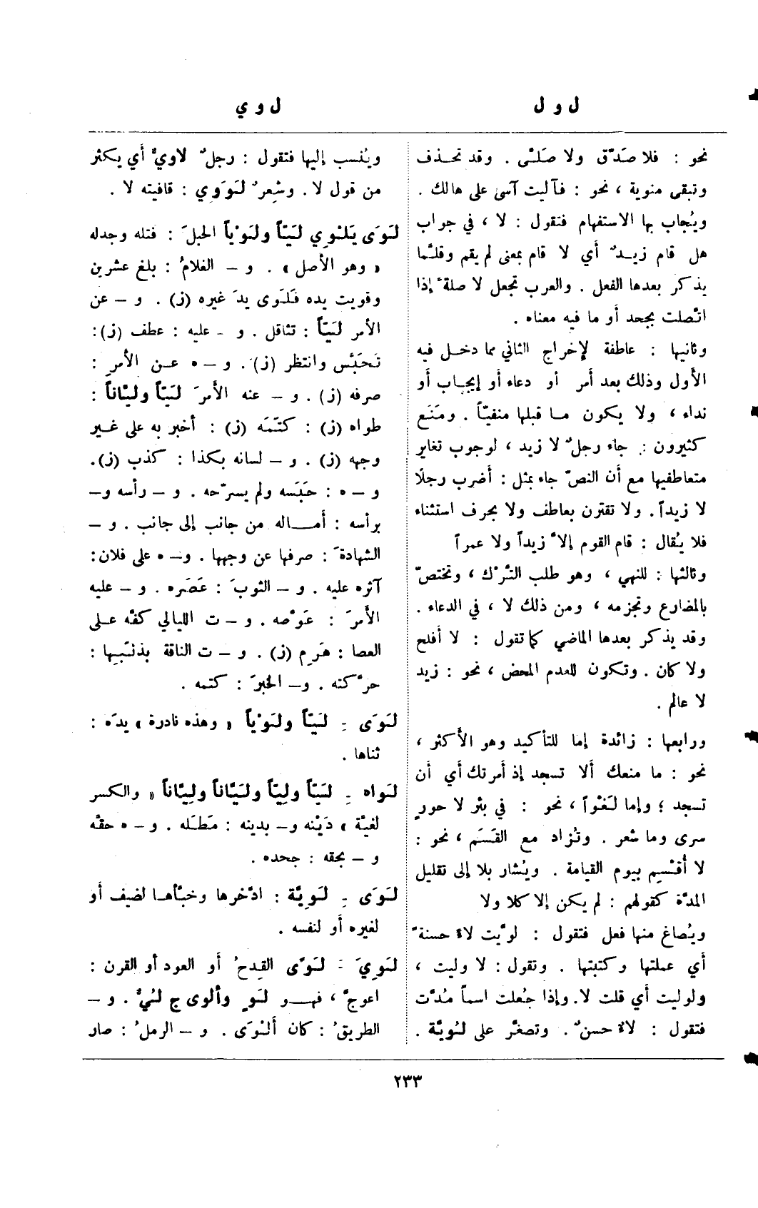 لوي يلوي ليًا ولويًا الحبل: فتله وجدله "وهو الأصل". و- الغلام: بلغ عشرين وقويت بده فلوي يد غيره (ز). و- عن الأمر ليًا: تثاقل. و- عليه: عطف (ز): تحبس وانتظر (ز). و- هـ عن الأمر: صرفه (ز). و- عنه الأمر ليًا وليانًا: طواه (ز): كتمه (ز): أخبر به علي غير وجهه (ز). و- لسانه بكذا: كذب (ز) و- هـ: حبسه ولم يسرحه. و- رأسه و- برأسه: أماله من جانب إلي جانب. و- الشهادة: صرفها عن وجهها. و- هـ علي فلان: آثره عليه. و- الثوب: عصره. و- عليه الأمر: عوصه. و- ت الليالي كفه علي العصا: هرم (ز). و- ت الناقة بذنبها: حر كته. و- الخبر: كتمه.