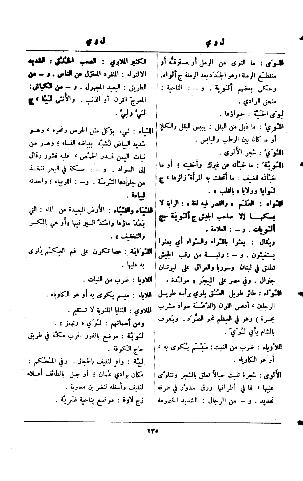 اللوي: ما التوي من الرمل أو مترقه أو منقطع الرملة، وهو الجدد بعد الرملة ج ألواء. وحكي بعضهم ألوية. و-: الناحية: منحني الوادي.
