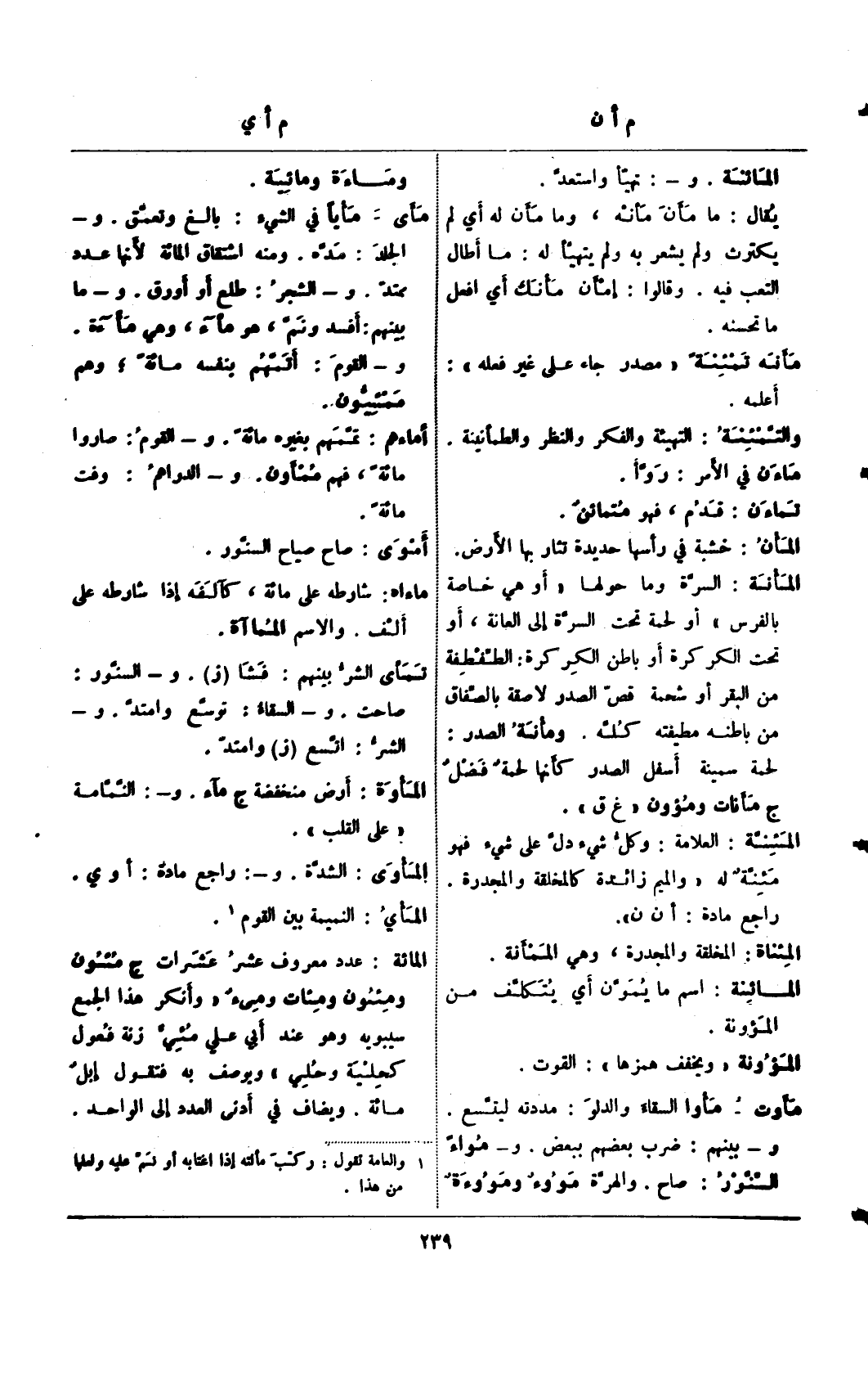مأي – مأيًا في الشيء: بالغ وتعمق. و- الجلد: مده. ومنه اشتقاق المائة لأنها عدد ممتد. و-الشجر: طلع أو أوراق. و- ما بينهم: أفسد وتم، هو مأء، وهي مأءة. و- القوم: أتمهم بنفسه مائة؛ وهم ممئيون.