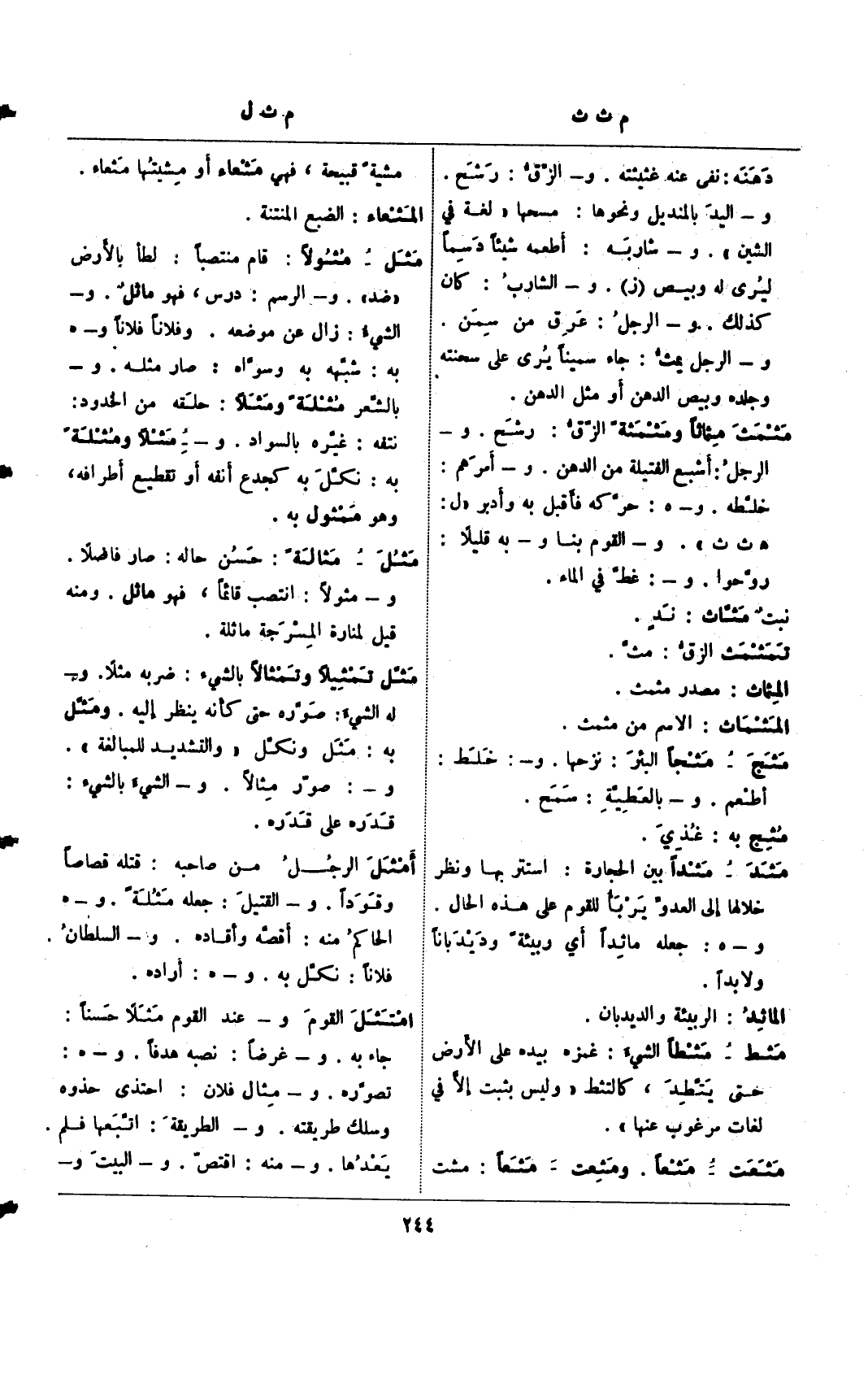 مثل – مثولًا: قام منتصبًا: لطأ بالأرض "ضد". و- الرسم: درس، فهو ماثل. و- الشيء: زال عن موضعه. وفلانًا فلانًا و- هـ به: شبهه به وسواه: صار مثله. و- بالشعر مثلة ومثلًا: حلقه من الخدود: نتفه: غيره بالسواد. و- مثلًا ومثلة به: نكل به كجده أنفه أو تقطيع أطرافه، وهو ممثول به.