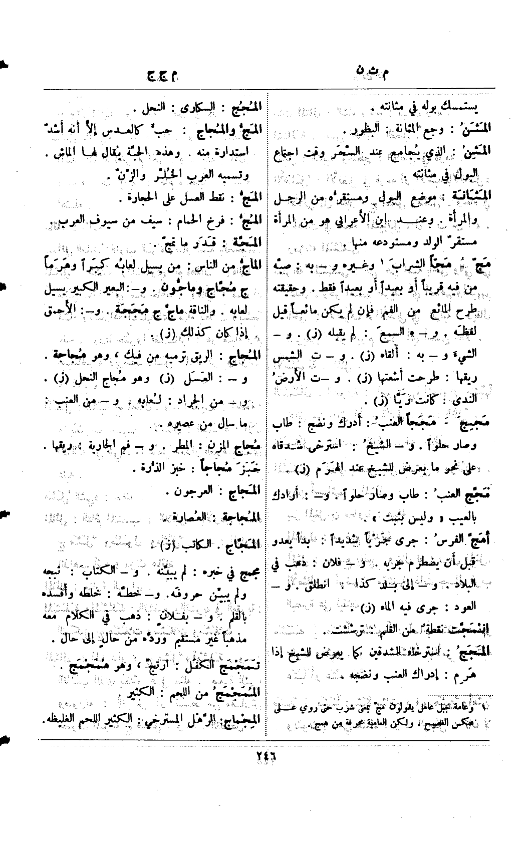 (¬1) وعامة جبل عامل يقولون مج بمعني شرب حتي روي علي عكس الفصيح. ولكن العامية محرفة من همج.