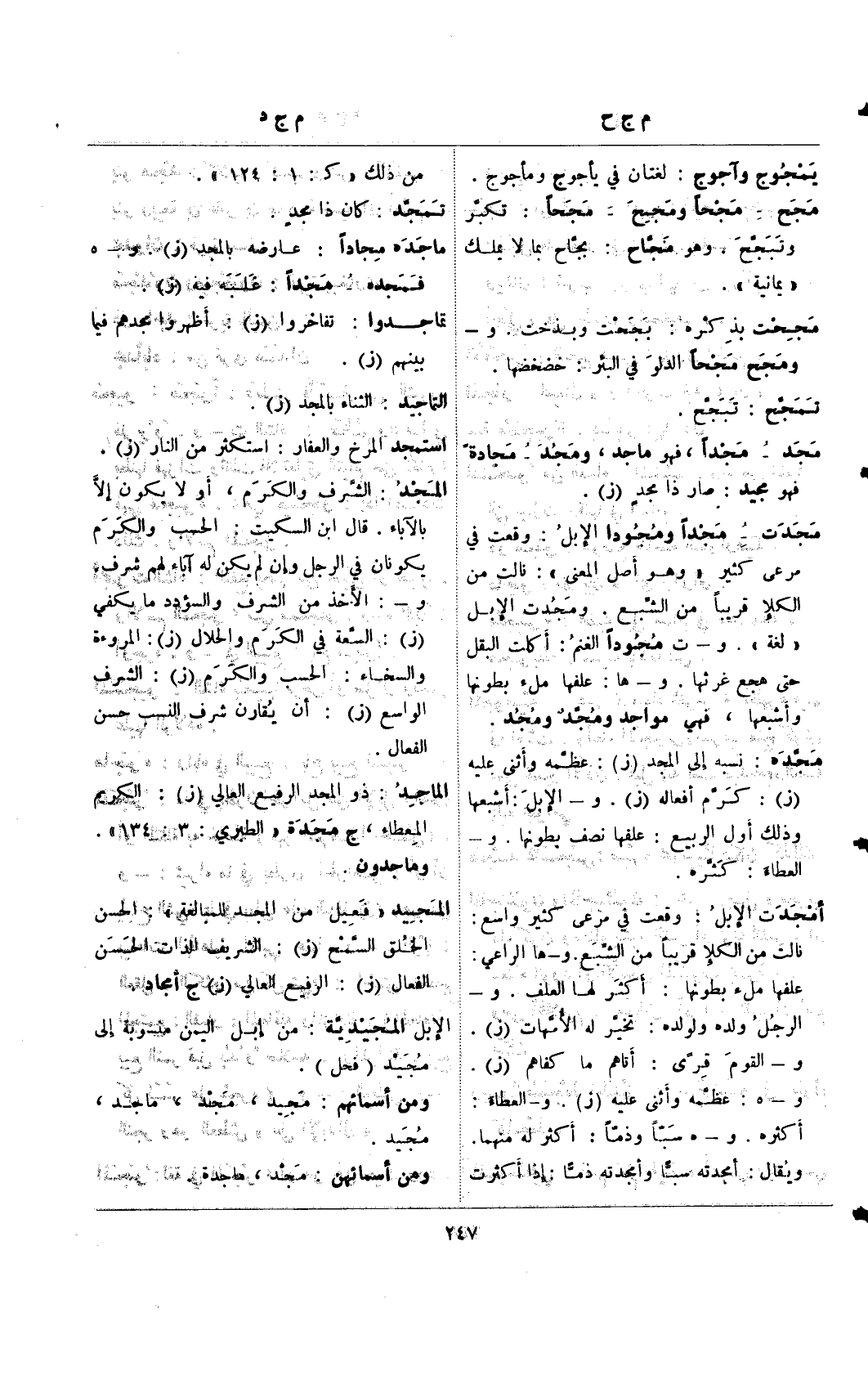 مجدت – مجدًا ومجودًا الإبل: وقعت في مرعي كثير "وهو أصل المعني": نالت من الكلإ قريبًا من الشبع. ومجدت الإبل "لغة". و- ت مجودًا الغنم: أكلت البقل حتي هجع غرثها. و- ها: علفها ملء بطونها وأشبعها، فهي مواجد ومجد ومجد.