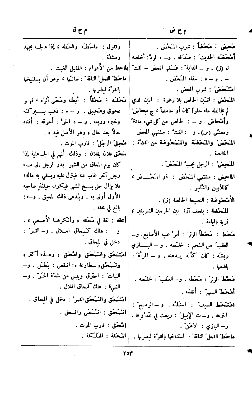 محقه- محقًا: أبطله ومحي أثره، فهو ممحوق ومحيق. و- هـ: ذهب ببركته وخيره وريعه. و- هـ الحر: أحرقه: أفناه حالًا بعد حال "وهو الأصل فيه".