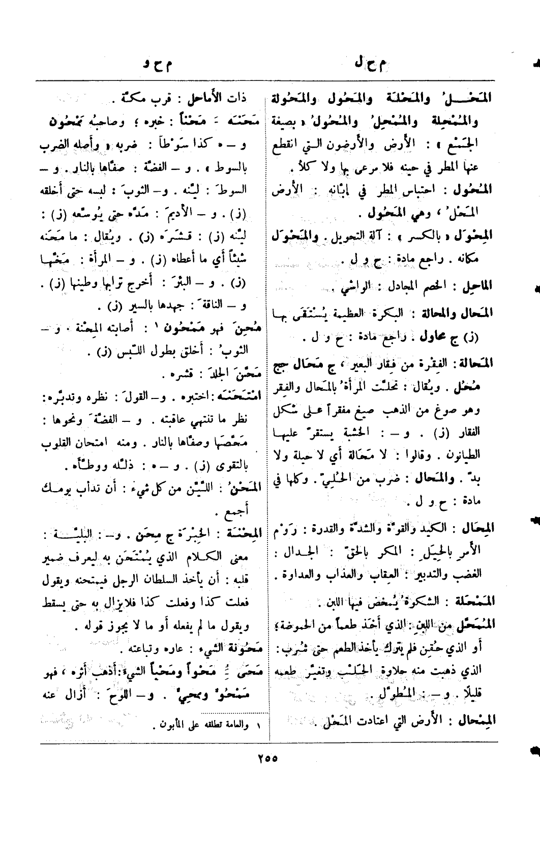 الممحل من اللبن: الذي أخذ طعمًا من الحموضة؛ أو الذي حقن فلم يترك يأخذ الطعم حتي شرب: الذي ذهبت منه حلاوة الجلب وتغير طعمه قليلًا. و-: المطول.