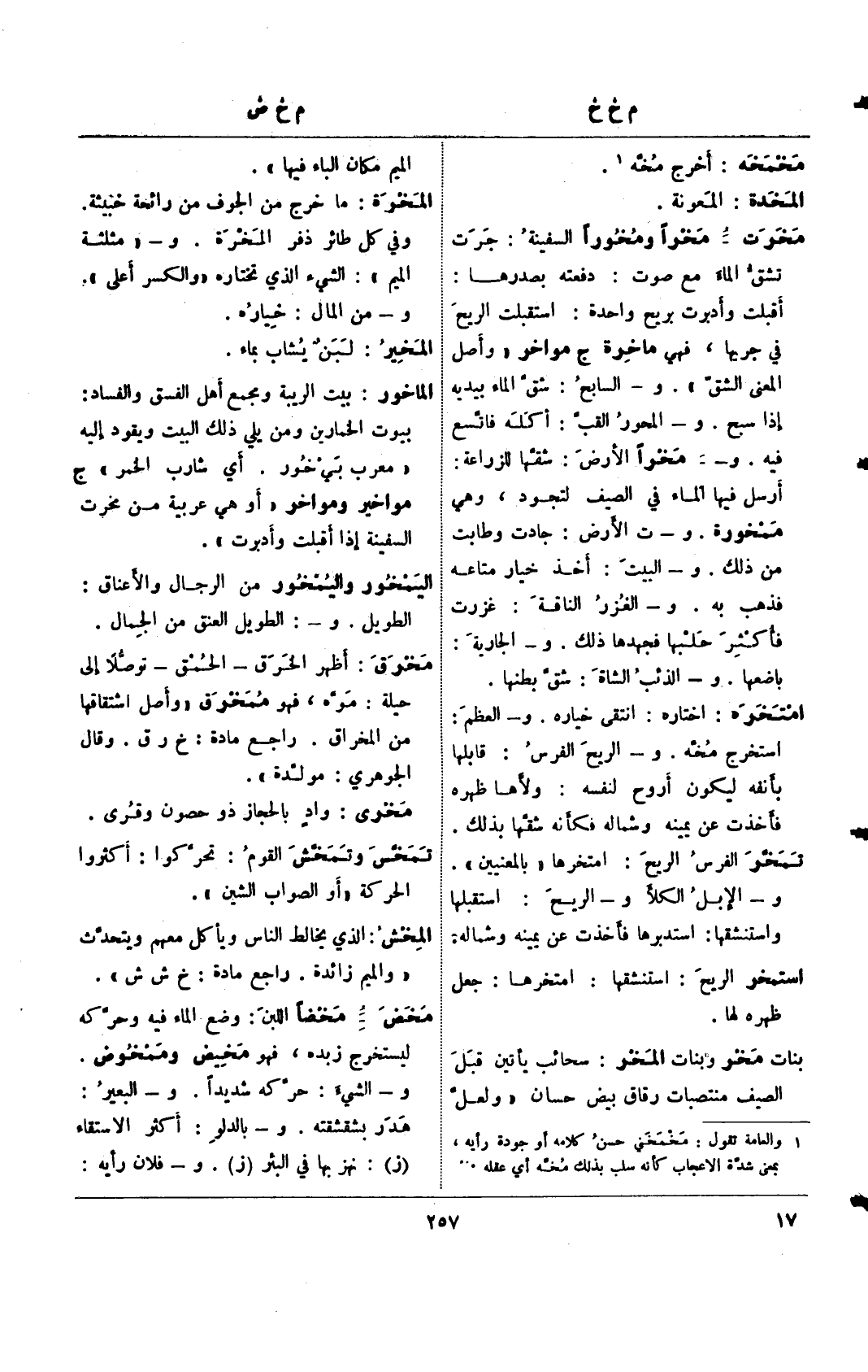 مخرت- مخوًا ومخورًا السفينة: جرت تشق الماء مع صوت: دفتعه بصدرها: أقبلت وأدبرت بريح واحدة: استقبلت الريح في جريها، فهي ماخرة ج مواخر "وأصل المعني الشق". و- السابح: شق الماء بيديه إذا سبح. و- المحور القب: أكله فاتسع فيه. و- مخرًا الأرض: شقتها للزراعة: أرسل فيها الماء في الصيف لتجود، وهي ممخورة. و- ت الأرض: جادت وطابت من ذلك. و- البيت: أخذ خيار متاعه فذهب به. و- الغزر الناقة: غزرت فأكثر حلبها فجهدها ذلك. و- الجارية: باضعها. و- الذئب الشاة: شق بطنها.