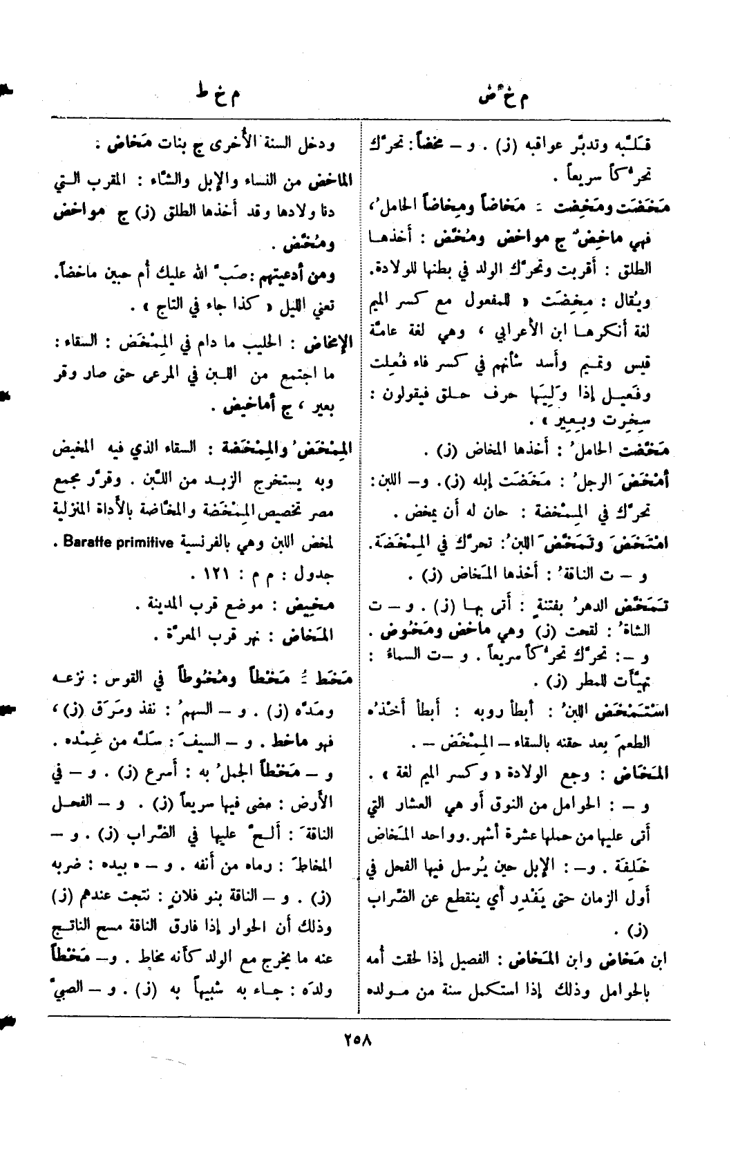 و- ت الناقة: أخذها المخاض (ز). تمخض الدهر بفتنة: أتي بها (ز). و- ت الشاة: لقحت (ز) وهي ماخض ومخوض. و-: تحرك تحركا سريعا. و- ت السماء: تهيأت للمطر (ز). استمخض اللبن: أبطأ روبه: أبطأ أخذه الطعم بعد حقنه بالسقاء- الممخض-. المخاض: وجع الولادة "وكسر الميم لغة". و-: الحوامل من النوق أو هي العشار التي أتي عليها من حملها عشرة أشهر. وواحد المخاض خلفة. و-: الإبل حين يرسل فيها الفحل في أول الزمان حتي يفدر أي ينقطع عن الضراب (ز). ابن مخاض وابن المخاض: الفصيل إذا لحقت أمه بالحوامل وذلك إذا استكمل سنة من مولده.