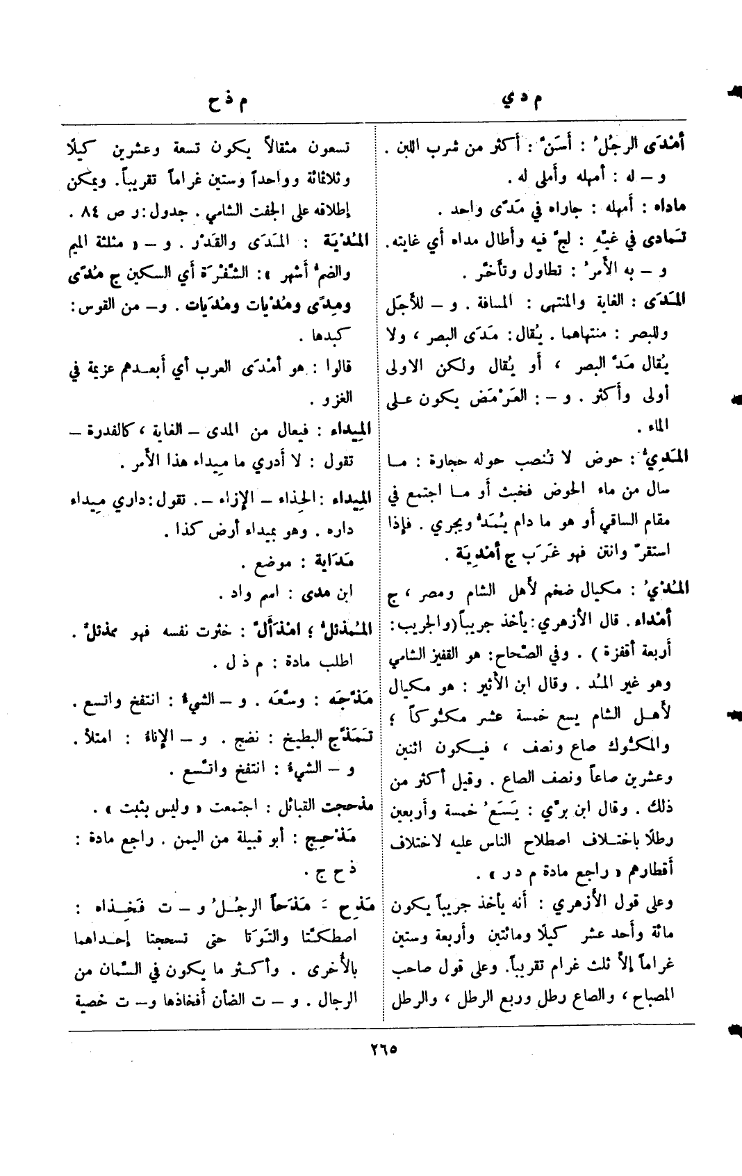 المدى: مكيال ضخم لأهل الشام ومصر، ج أمداد. قال الأزهري: يأخذ جريبًا (والجريب: أربعة أقفزة). وفي الصحاح: هو القفيز الشامي وهو غير المد. وقال ابن الأثير: هو مكيال لأهل الشاك يسع خمسة عشر مكوكًا؛ والمكوك صاع ونصف، فيكون اثنين وعشرين صاعًا ونصف الصاع. وقيل أكثر من ذلك. وقال ابن بري: يسع خمسة وأربعين رطلًا باختلاف اصطلاح الناس عليه لاختلاف أقطارهم "راجع مادة م د ر".