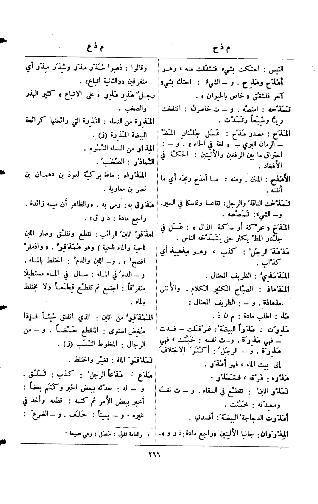 مذع – مذعًا الرجل: كذب: تملق. و- له: حدثه ببعض الخبر وكتم بعضًا: أخبر ببعض الأمر ثم كتمه: قطعه وأخذ في غيره. و- يمينًا: حلف. و- الضرع: