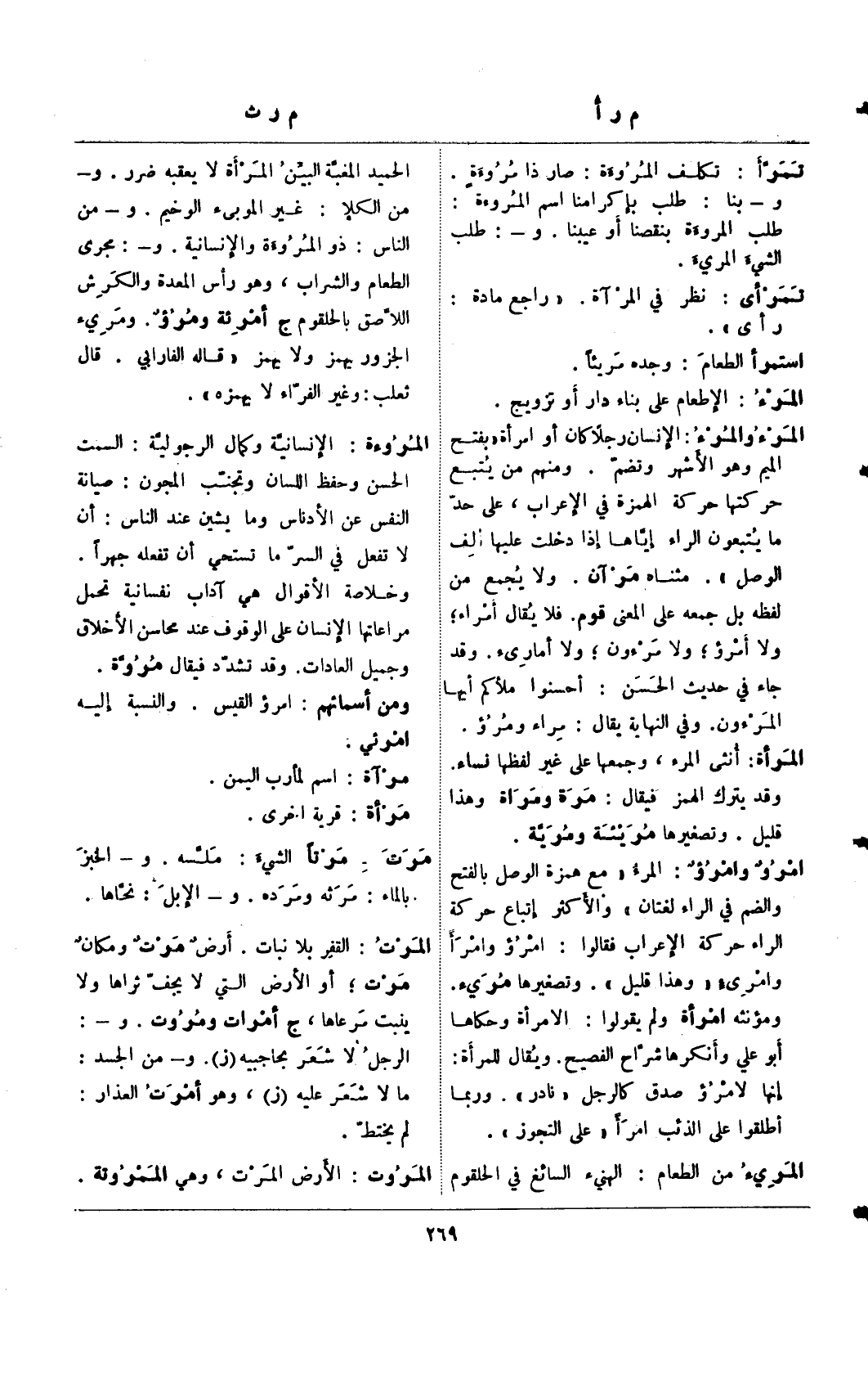 امرو وامرؤ: المرء "مع همزة الوصل بالفتح والضم في الراء لغتان" والأكثر إتباع حركة الراء حركة الإعراب فقالوا: امرؤ وامرأ وامريء "وهذا قليل". وتصغيرها مريء. ومؤنثه امرأة ولم يقولوا: الامرأة وحكاها أبو علي وأنكرها شراح الفصيح. ويقال للمرأة: إنها لا مرؤ صدق كالرجل "نادر". وربما أطلقوا علي الذئب امرأ "علي التجوز".