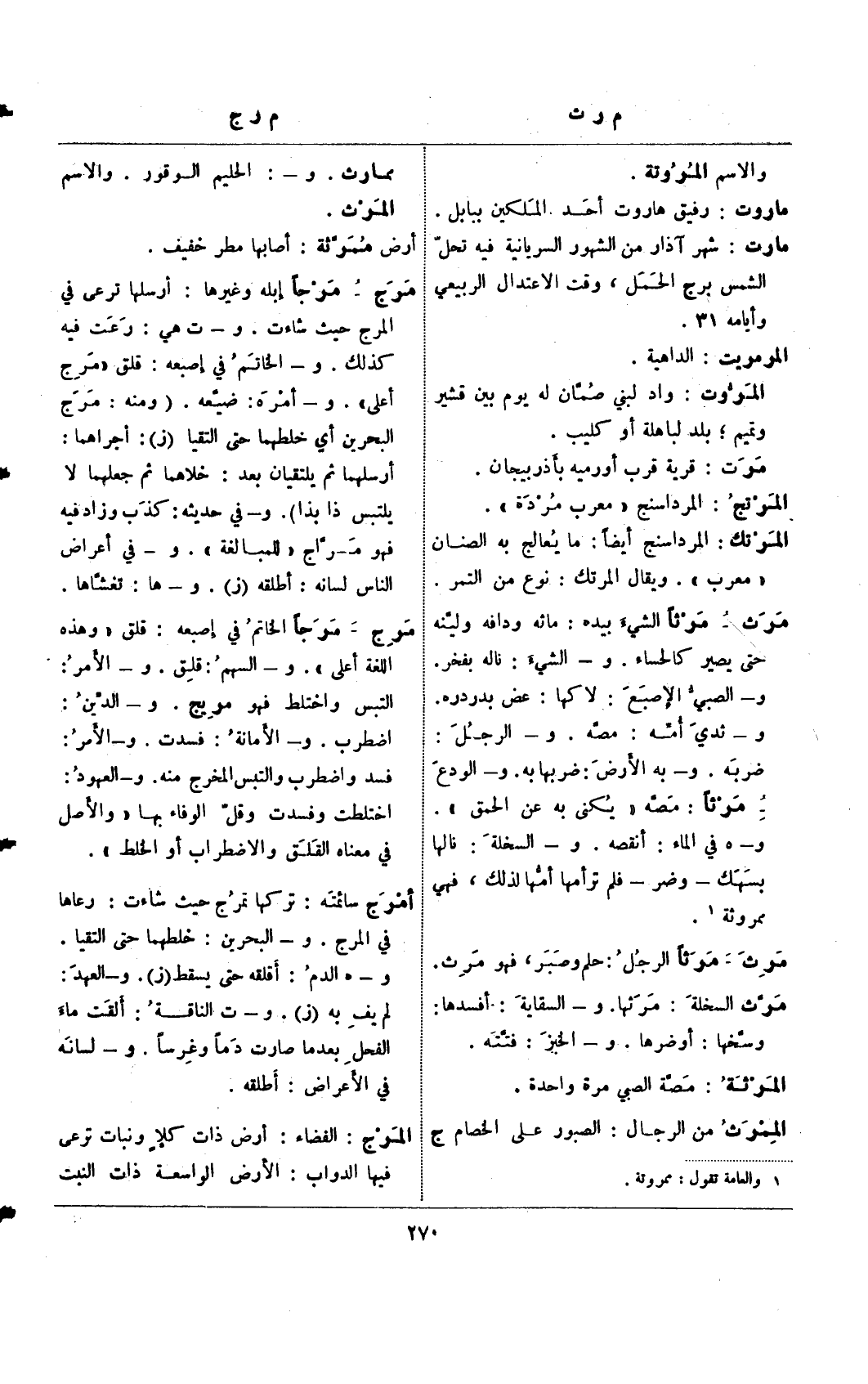 مرث – مرثًا الشيء بيده: ماثه ودافه ولينه حتي يصير كالحساء. و- الشيء: ناله بفخر. و- الصبي الإصبع: لاكها: عض بدردره. و- ثدي أمه: مصه. و- الرجل: ضربه. و- به الأرض: ضربها به. و- الودع مرثًا: مصه "يكني به عن الحمق". و- هـ في الماء: أنقصه. و- السخلة: نالها بسهك – وضر – فلم ترأمها أمها لذلك، فهي ممروثة (¬1).