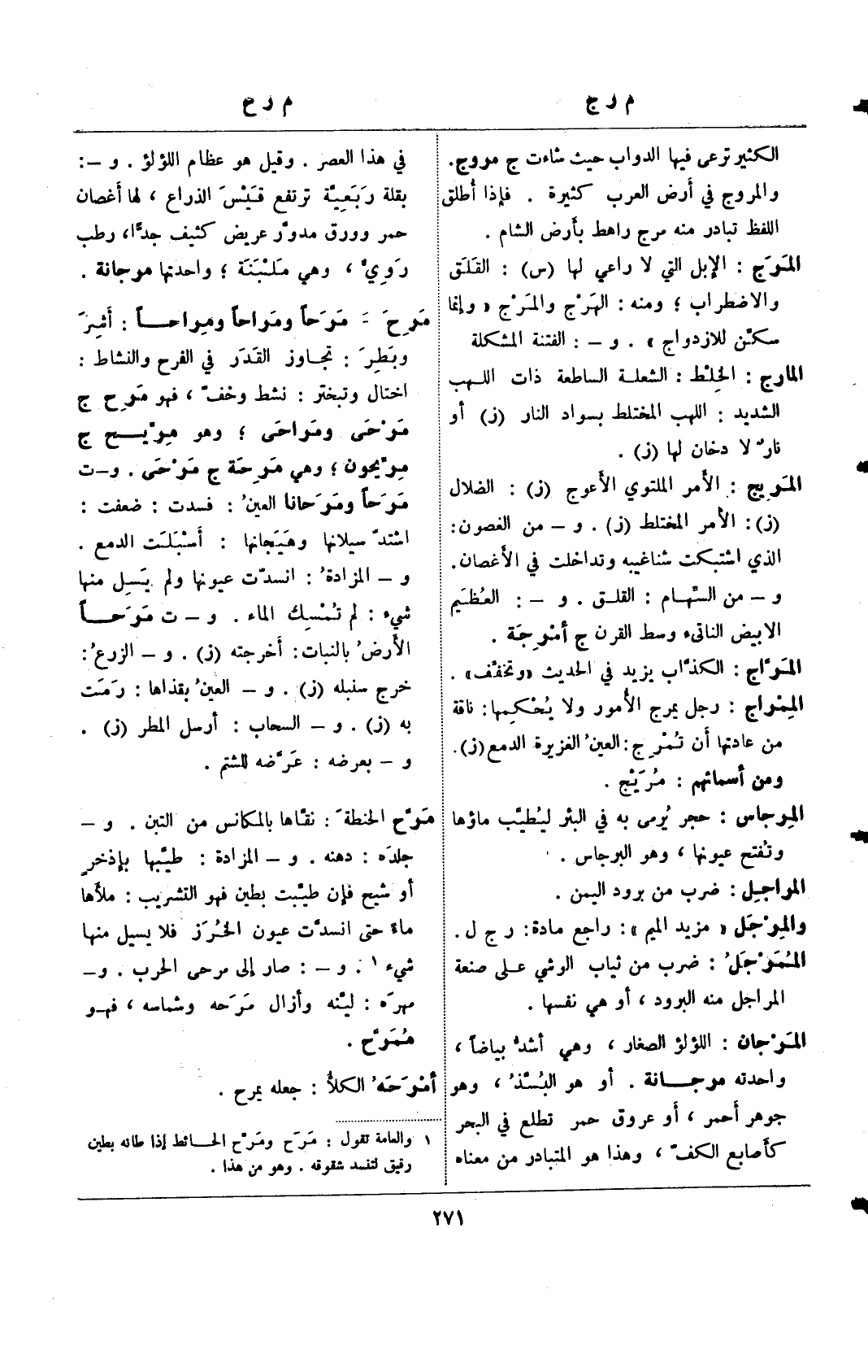 المرج: الإبل التي لا راعي لها (س): القلق والاضطراب؛ ومنه: الهرج والمرج "وإنما سكن للازدواج". و-: الفتنة المشكلة المارح: الخلط: الشعلة الساطعة ذات اللهب الشديد: اللهب المختلط بسواد النار (ز) أو نار لا دخان لها (ز).