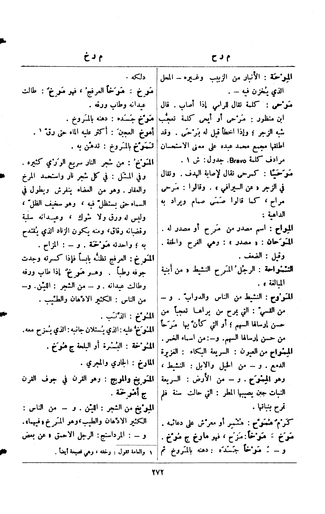 المروح: النشيط من الناس والدواب. و- من القسي: التي يمرح من يراها تعجبًا من حسن إرسالها السهم؛ أو التي كأن بها مرحًا من حسن إرسالها السهم. و-: من أسماء الخمر.