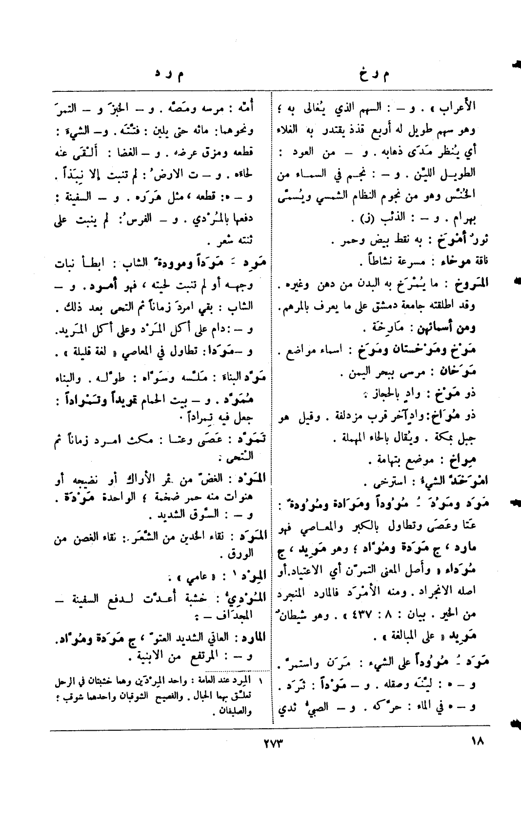 مرد – مرودًا علي الشيء: مرن واستمر. و- هـ: لينه وصقله. و- مردًا: ثرد. و- هـ في الماء: حركه. و- الصبي ثدي