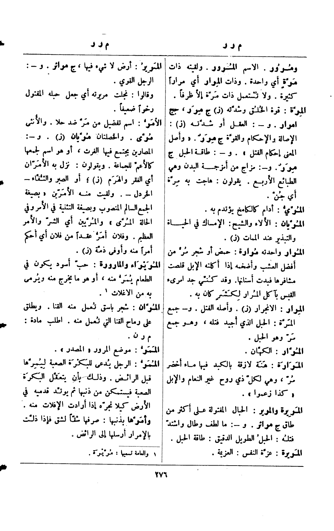 المرة: قوة الخلق وشدته (ز) ج مرر، جج امرار. و-: العقل أو شدته (ز): الإصالة والإحكام والقوة ج مرر. "وأصل المعني إحكام الفتل". و-: طاقة الحبل ج مرر. و-: مزاج من أمزجة البدن وهي الطبائع الأربع. يقولون: هاجت به مرة أي جن.
