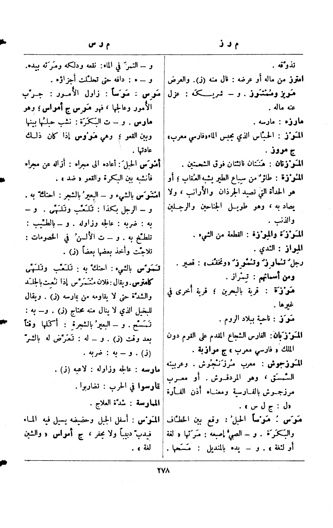 مرس – مرسًا: زاول الأمور: جرب الأمور وعالجها، فهو مرس ج أمراس؛ وهو مارس. و-ت البكرة: نشب حبلها بينها وبين القعو؛ وهي مروس إذا كان ذلك عادتها.
