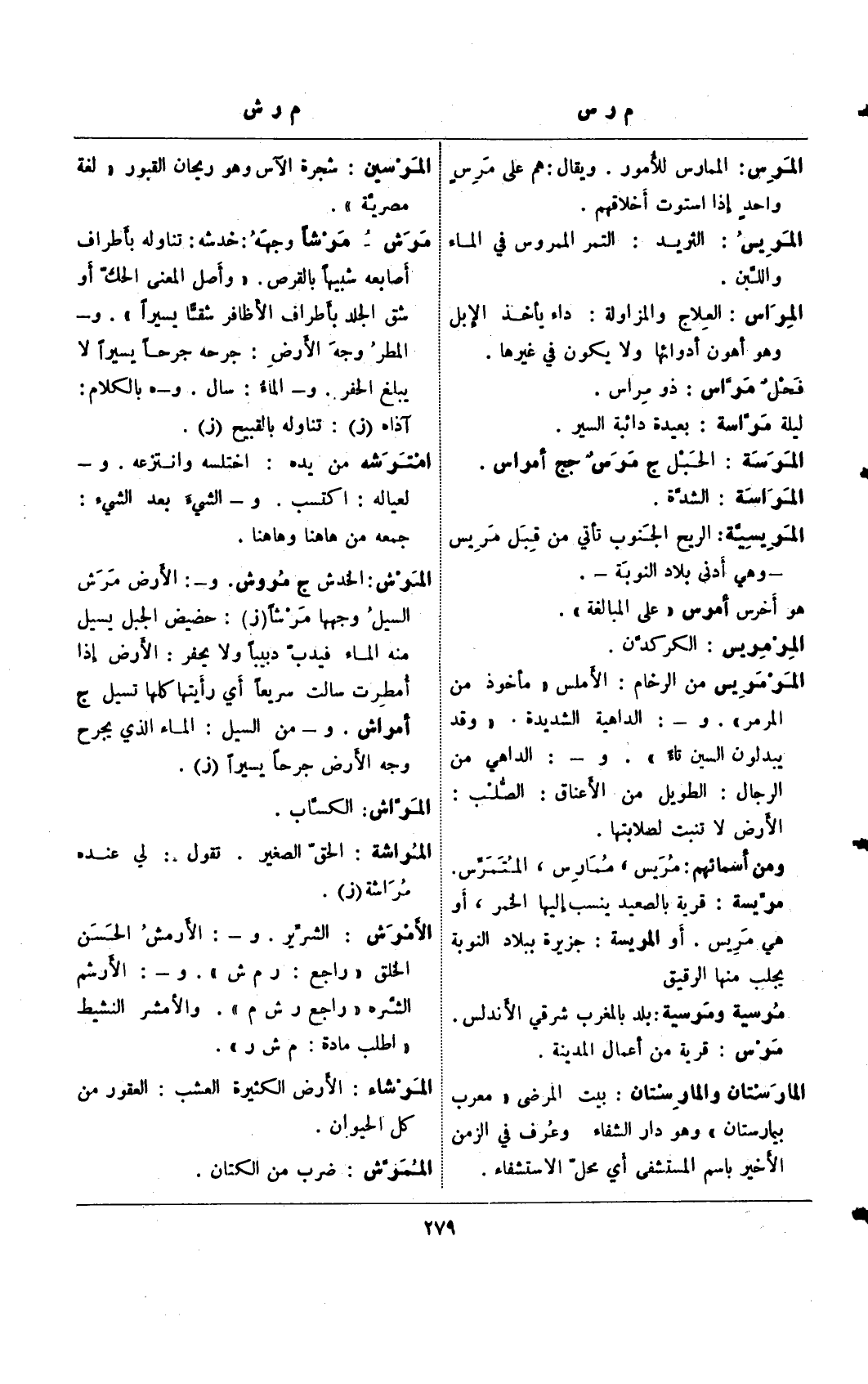 مرش – مرشًا وجهه: خدسه: تناوله بأطراف أصابعه شبيهًا بالقرص. "وأصل المعني الحك أو شق الجلد بأطراف الأظافر شقًا يسيرًا". و- المطر وجه الأرض: جرحه جرحًا يسيرًا لا يبلغ الحفر. و- الماء: سال. و- هـ بالكلام: آذاه (ز): تناوله بالقبيح (ز).