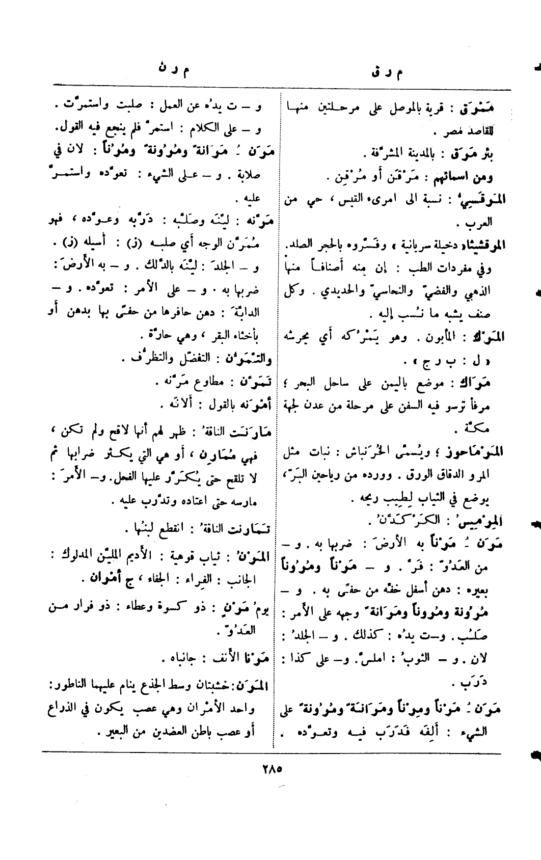 مرن – مرنًا به الأرض: ضربها به. و- من العدو: فز. و- مرنًا ومرونًا بعيره: دهن أسفل خفه من حفي به. و- مرونة ومرونًا ومرانة وجهه علي الأمر: صلب. و-ت يده: كذلك. و- الجلد: لان. و- الثوب: أملس. و- علي كذا: درب.