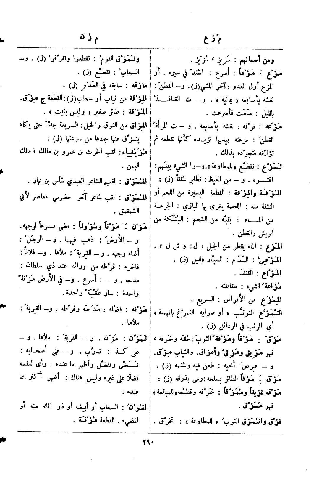 مزن – مزنًا ومزونًا: مضي مسرعًا لوجهه. و- الأرض: ذهب فيها. و- الرجل: أضاء وجهه. و- القربة: ملأها. و- فلانًا: فاخره: قرظه من ورائه عند ذي سلطان: مدحه. و-: أسرع. و- في الأرض مزنة واحدة: سار عقبة واحدة.