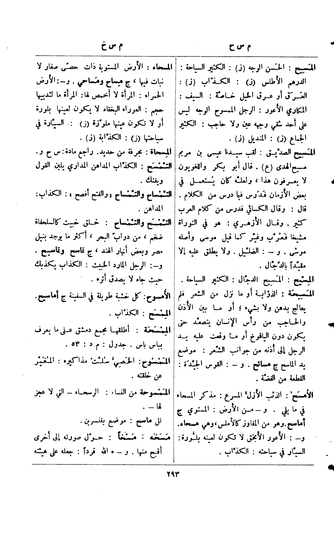 المسيح: الحسن الوجه (ز): الكثير السياحة: الدرهم الأطلس (ز): الكذاب (ز): العرق أو عرق الخيل خاصة: السيف: المكاري الأعور: الرجل الممسوح الوجه ليس علي أحد شقي وجهه عين ولا حاجب: الكثير الجماع (ز): المنديل (ز).