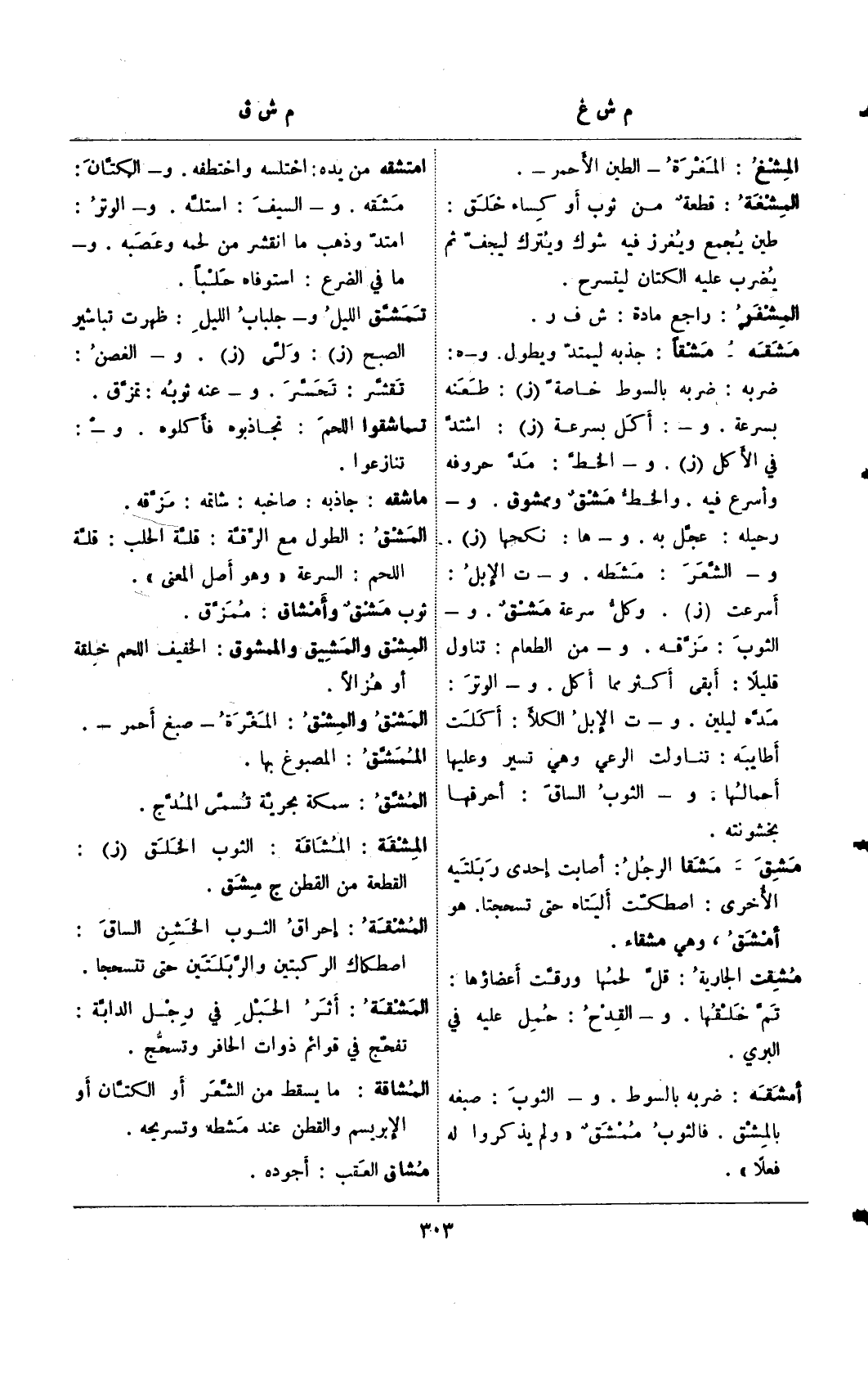 مشقه – مشقا: جذبه ليمتد ويطول. و- هـ: ضربه: ضربه بالسوط خاصة (ز): طعنه بسرعة. و-: أكل بسرعة (ز): اشتد في الأكل (ز). و- الخط: مد حروفه وأسرع فيه. والخط مشق وممشوق. و- رحيله: عجل به. و- ها: نكحها (ز). و- الشعر: مشطه. و- ت الإبل: أسرعت (ز). وكل سرعة مشق. و- الثوب: مزقه. و- من الطعام: تناوله قليلا: أبقى أكثر مما أكل. و- الوتر: مده ليلين. و- ت الإبل الكلأ: أكلت أطايبه: تناولت الرعي وهي تسير وعليها أحمالها. و- الثوب الساق: أحرقها بخشونته.