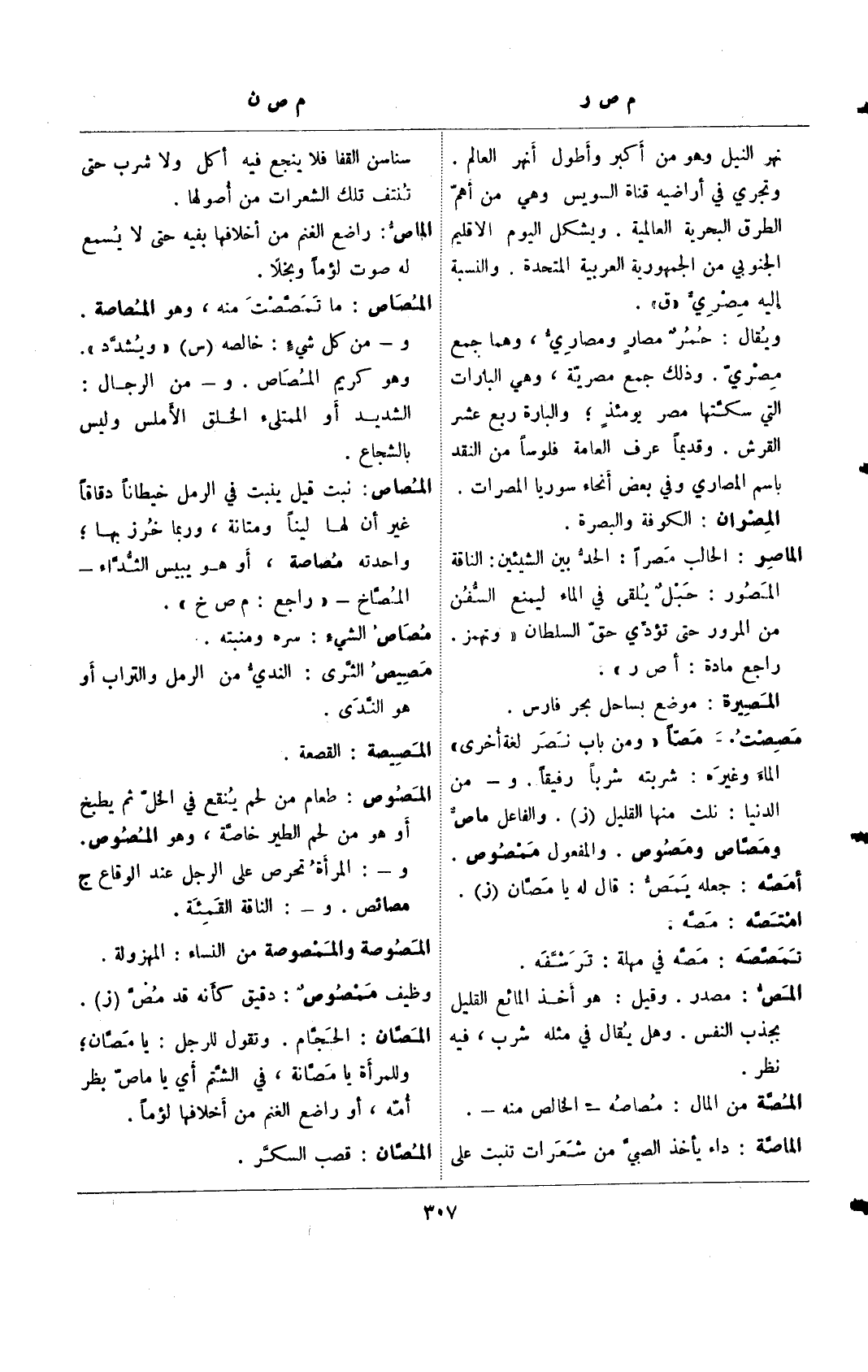 المصوص: طعام من لحم ينقع في الخل ثم يطبخ أو هو من لحم الطير خاصة، وهو المصوص. و-: المرأة تحرص على الرجل عند الوقاع ج مصائص. و-: الناقة القمئة.
