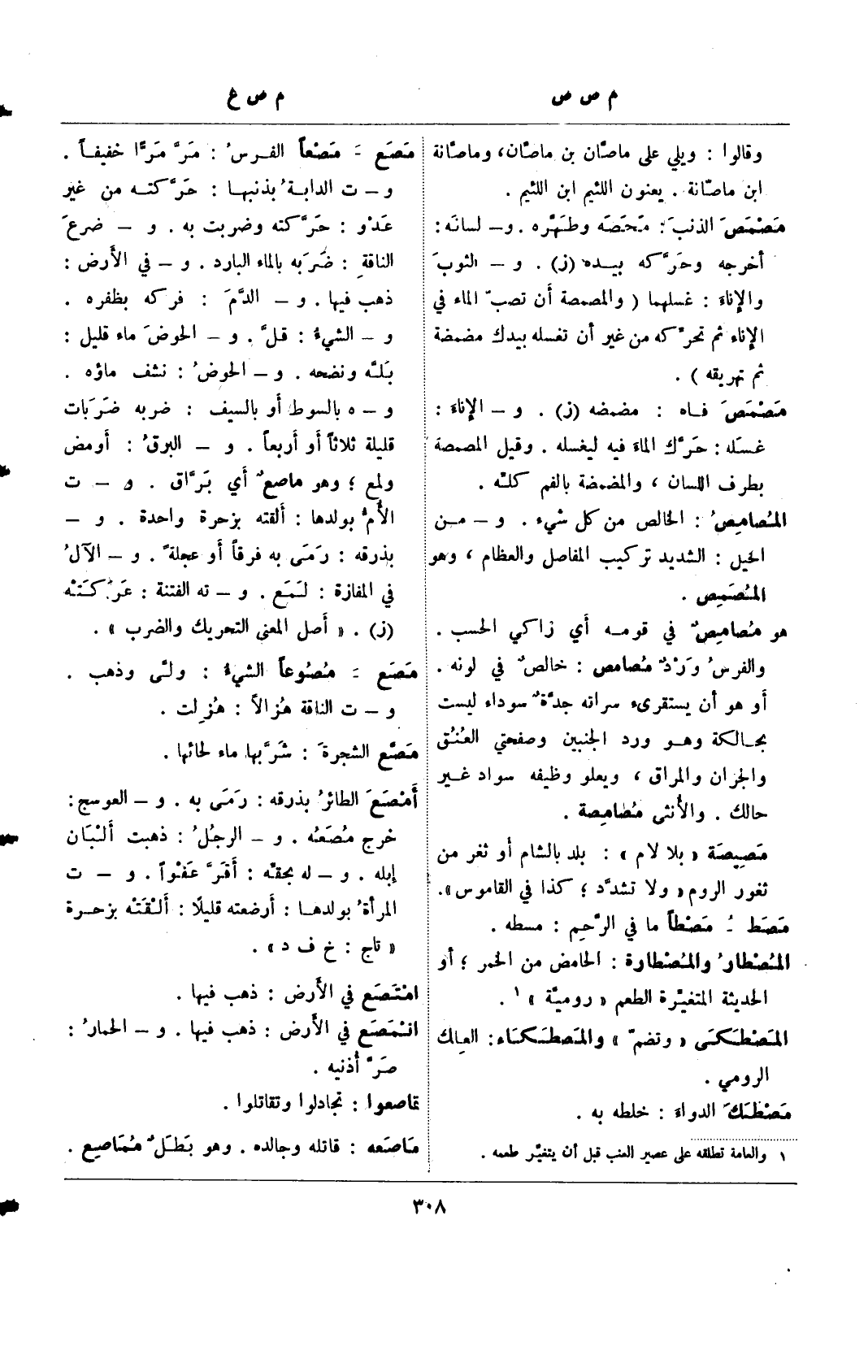 مصع – مصعا الفرس: مر مرا خفيفا. و- ت الدابة بذنبها: حركته من غير عدو: حركته وضربت به. و- في الأرض: ذهب فيها. و- الدم: فركه بظفره. و- الشيء: قل. و- الحوض ماء قليل: بله ونضحه. و- الحوض: نشف ماؤه. و- هـ بالسوط أو بالسيف: ضربه ضربات قليلة ثلاثا أو أربعا. و- البرق: أومض ولمع؛ وهو ماصع أي براق. و- ت الأم بولدها: ألقته بزحرة واحدة. و- بذرقه: رمى به فرقا أو عجلة. و- الآل في المفازة: لمع. و- ته الفتنة: غير عركته (ز). "أصل المعنى التحريك والضرب".