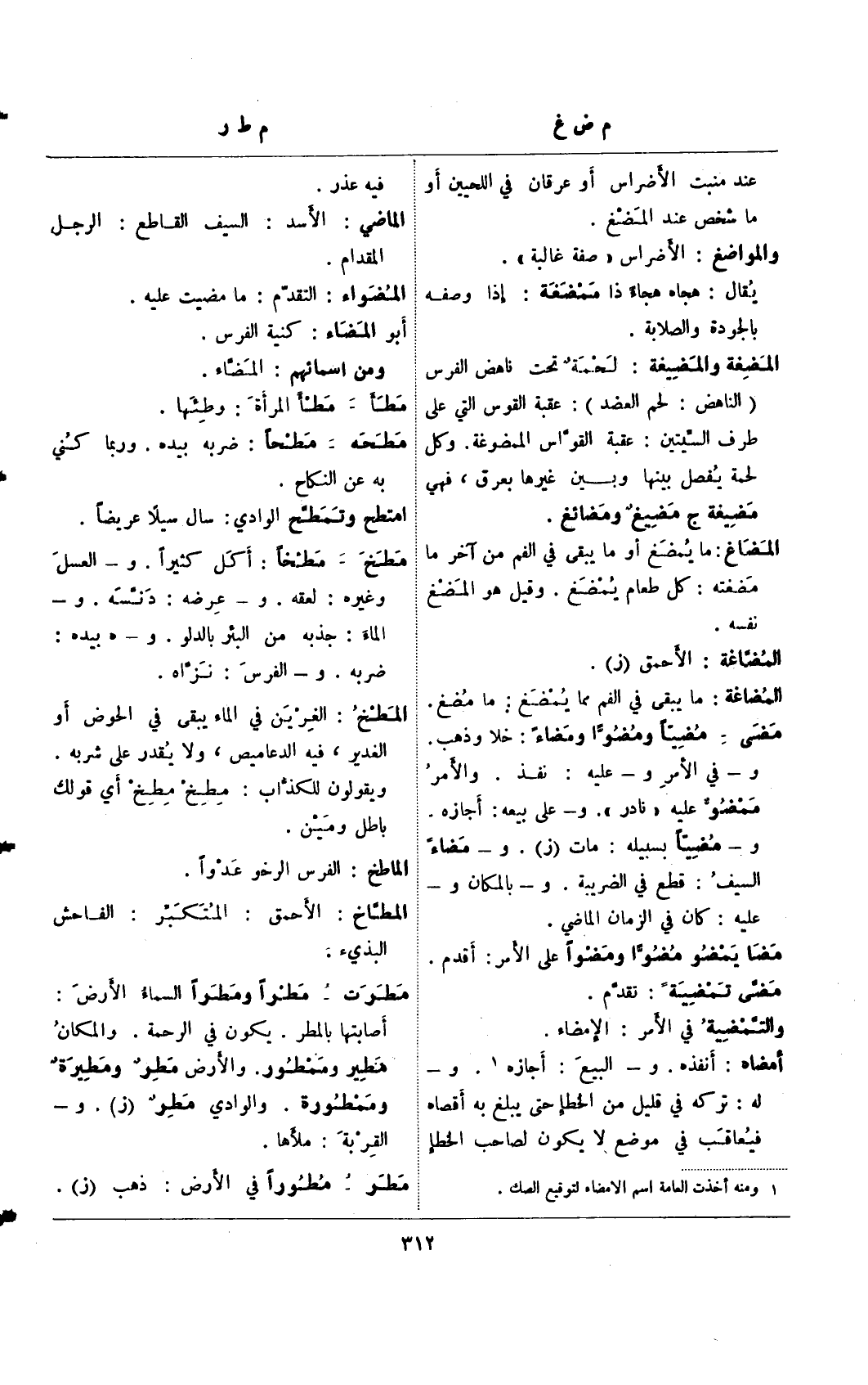 مضى - مضيا ومضوا ومضاء: خلا وذهب. و- في الأمر و- عليه: نفذ. والأمر ممضو عليه "نادر". و- على بيعه: أجازه. و- مضيا بسبيله: مات (ز). و- مضاء السيف: قطع في الضريبة. و- بالمكان و- عليه: كان في الزمان الماضي.