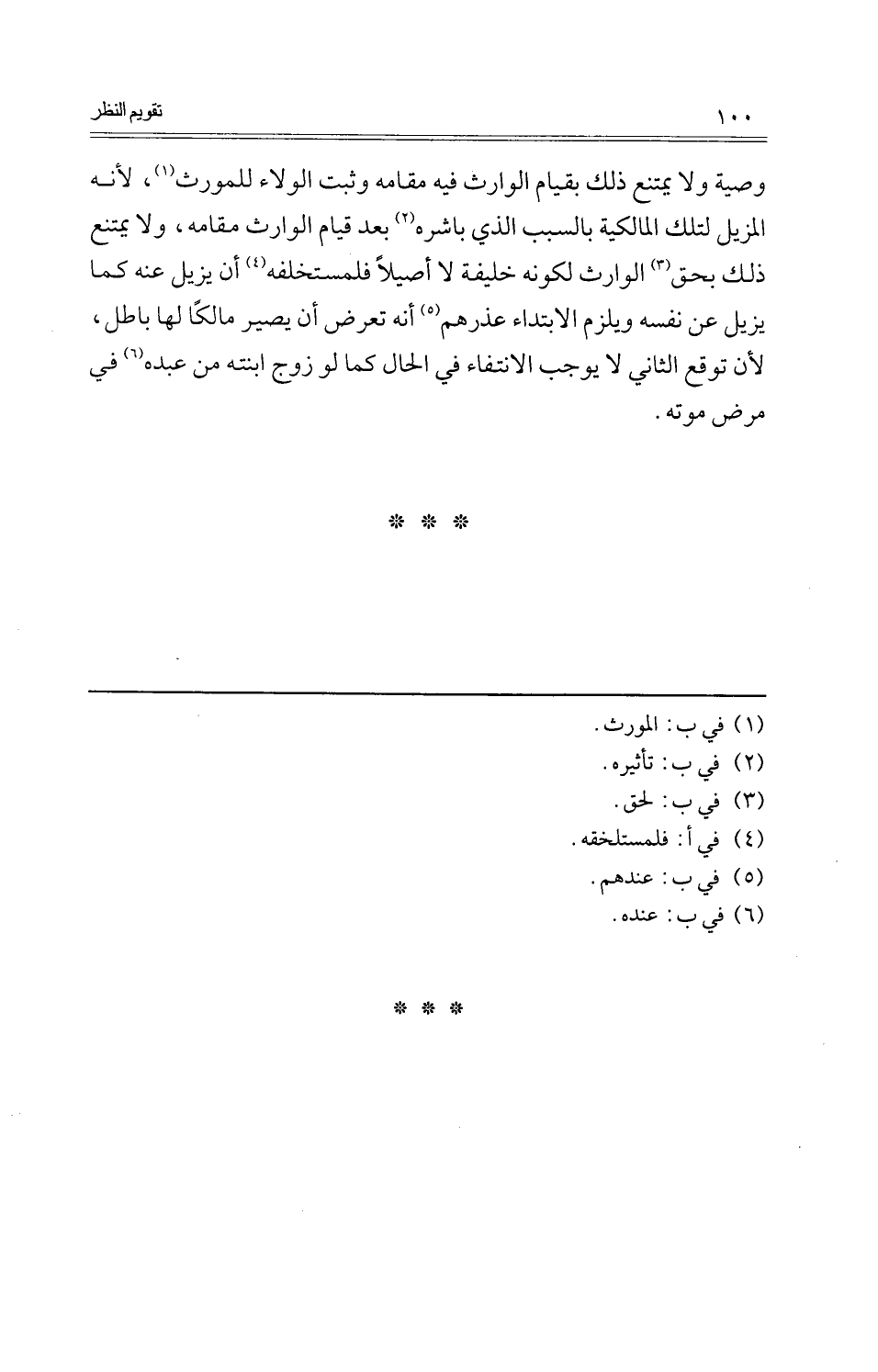 وَصِيَّة وَلَا يمْتَنع ذَلِك بِقِيَام الْوَارِث فِيهِ مقَامه وَثَبت الْوَلَاء للمورث، لِأَنَّهُ المزيل لتِلْك الْمَالِكِيَّة بِالسَّبَبِ الَّذِي بَاشرهُ بعد قيام الْوَارِث مقَامه، وَلَا يمْتَنع ذَلِك بِحَق الْوَارِث لكَونه خَليفَة لَا أصيلا فلمستخلفه أَن يزِيل عَنهُ كَمَا يزِيل عَن نَفسه وَيلْزم الِابْتِدَاء عذرهمْ أَنه تعرض أَن يصير مَالِكًا لَهَا بَاطِل، لِأَن توقع الثَّانِي لَا يُوجب الانتفاء فِي الْحَال كَمَا لَو زوج ابْنَته من عَبده فِي مرض مَوته.