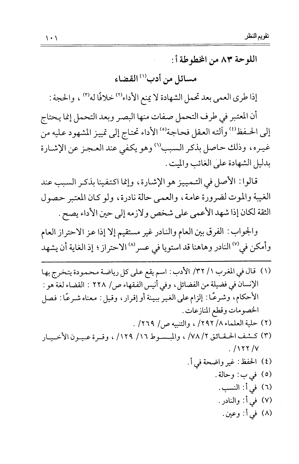 إِذا طرى الْعَمى بعد تحمل الشَّهَادَة لَا يمْنَع الْأَدَاء خلافًا لَهُ، وَالْحجّة: أَن الْمُعْتَبر فِي طرف التَّحَمُّل صِفَات مِنْهَا الْبَصَر وَبعد التَّحَمُّل إِنَّمَا يحْتَاج إِلَى الْحِفْظ وآلته الْعقل فحاجة الْأَدَاء تحْتَاج إِلَى تَمْيِيز الْمَشْهُود عَلَيْهِ من غَيره، وَذَلِكَ حَاصِل بِذكر السَّبَب وَهُوَ يَكْفِي عِنْد الْعَجز عَن الْإِشَارَة بِدَلِيل الشَّهَادَة على الْغَائِب وَالْمَيِّت.