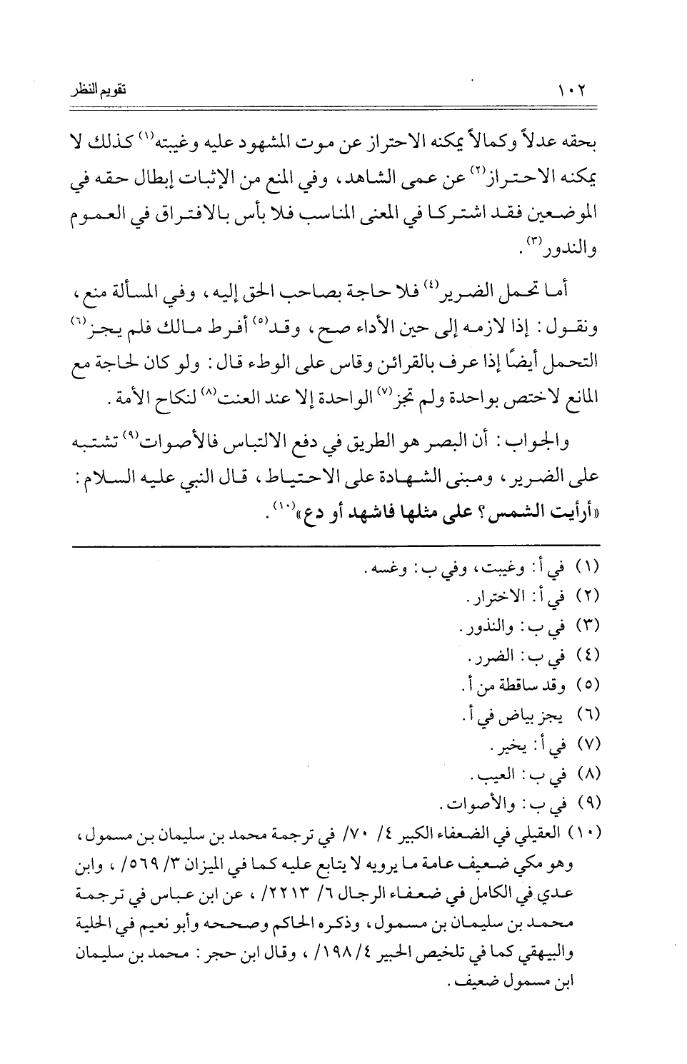 بِحقِّهِ عدلا وكمالا يُمكنهُ الِاحْتِرَاز عَن موت الْمَشْهُود عَلَيْهِ وغيبته كَذَلِك لَا يُمكنهُ الِاحْتِرَاز عَن عمى الشَّاهِد، وَفِي الْمَنْع من الْإِثْبَات إبِْطَال حَقه فِي الْمَوْضِعَيْنِ فقد اشْتَركَا فِي الْمَعْنى الْمُنَاسب فَلَا بَأْس بالافتراق فِي الْعُمُوم والندور.