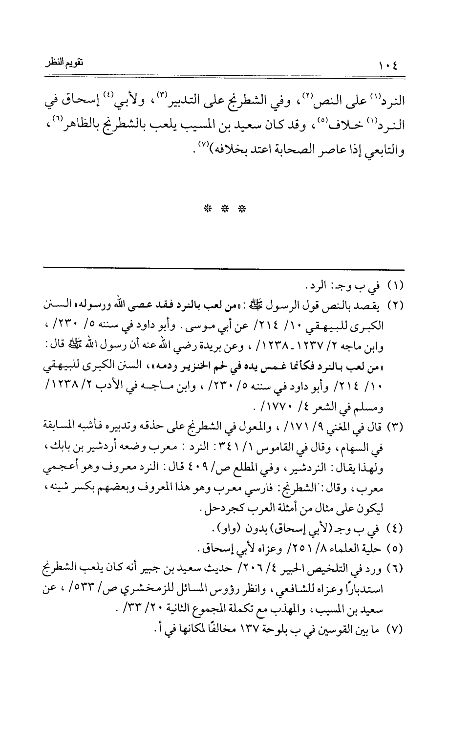 النَّرْد على النَّص، وَفِي الشطرنج على التَّدْبِير، وَلأبي إِسْحَاق فِي النَّرْد خلاف، وَقد كَانَ سعيد بن الْمسيب يلْعَب بالشطرنج بِالظَّاهِرِ، والتابعي إِذا عاصر الصَّحَابَة اعْتد بِخِلَافِهِ) .