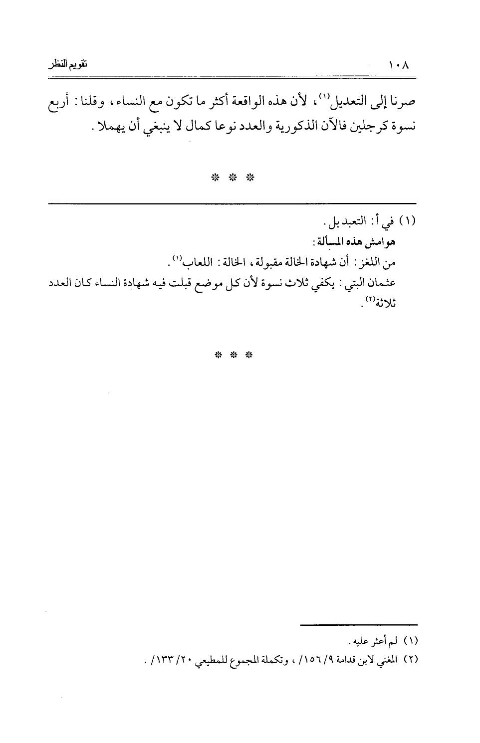 صرنا إِلَى التَّعْدِيل، لِأَن هَذِه الْوَاقِعَة أَكثر مَا تكون مَعَ النِّسَاء، وَقُلْنَا: أَربع نسْوَة كرجلين فَالْآن الذكورية وَالْعدَد نوعا كَمَال لَا يَنْبَغِي أَن يهملا.
