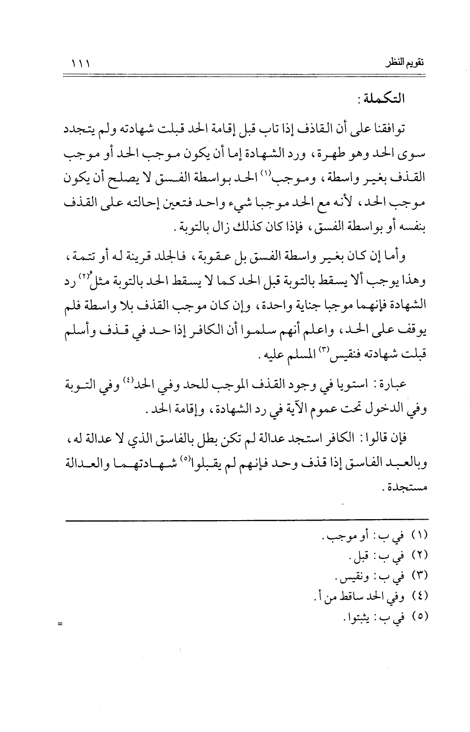 عبارَة: اسْتَويَا فِي وجود الْقَذْف الْمُوجب للحد وَفِي الْحَد وَفِي التَّوْبَة وَفِي الدُّخُول تَحت عُمُوم الْآيَة فِي رد الشَّهَادَة، وَإِقَامَة الْحَد. فَإِن قَالُوا: الْكَافِر استجد عَدَالَة لم تكن بَطل بالفاسق الَّذِي لَا عَدَالَة لَهُ، وبالعبد الْفَاسِق إِذا قذف وحد فَإِنَّهُم لم يقبلُوا شَهَادَتهمَا وَالْعَدَالَة مستجدة.